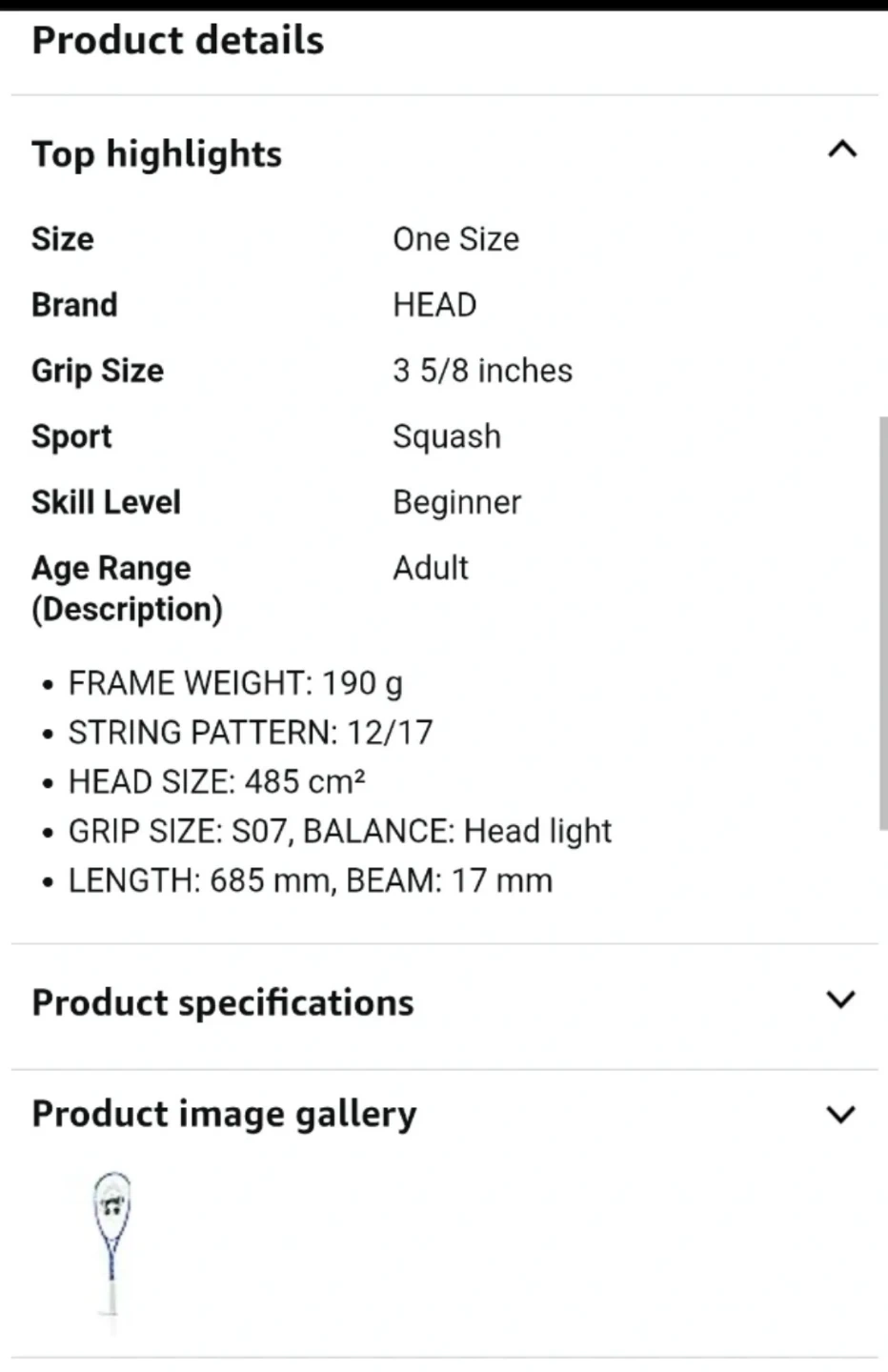 The racquet in the image is the HEAD Discovery Elite, a squash racquet typically designed for beginners.