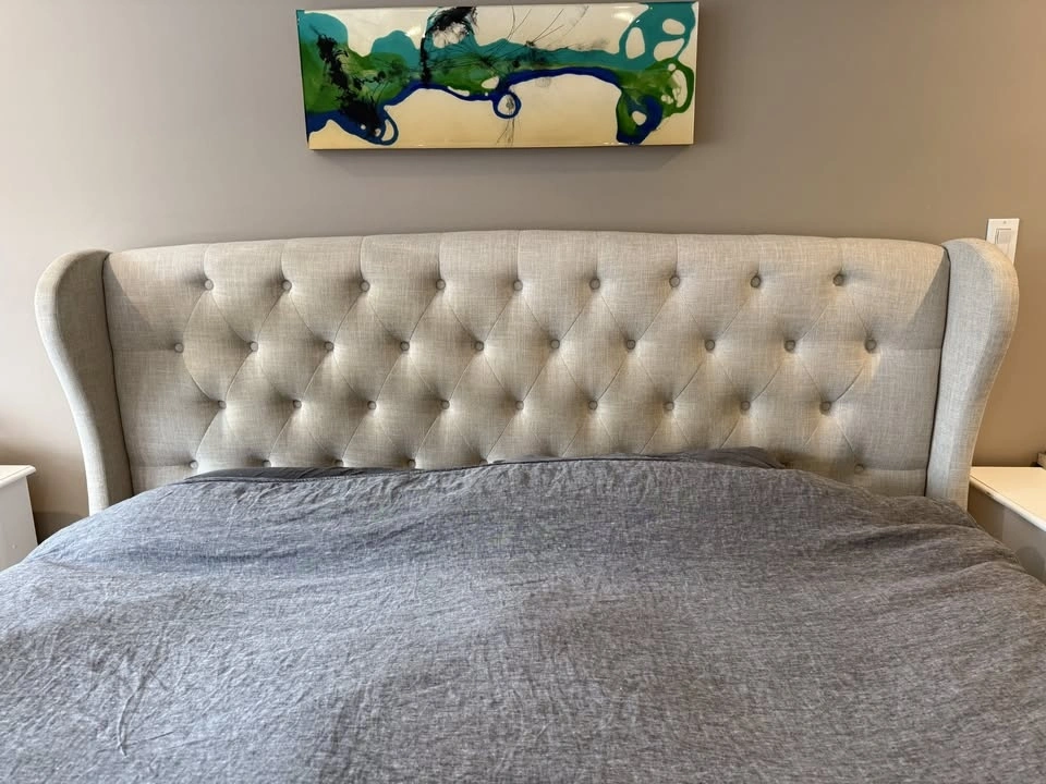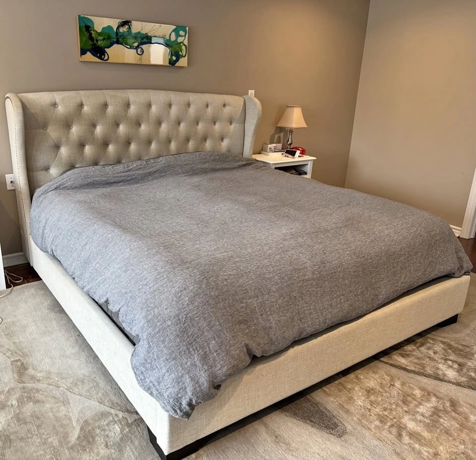 Beautiful king size upholstered bed in a neutral linen-look fabric that works with almost any décor. The bed has a wingback headboard with button tufting and nailhead trim. Solid, sturdy, and VERY comfortable.