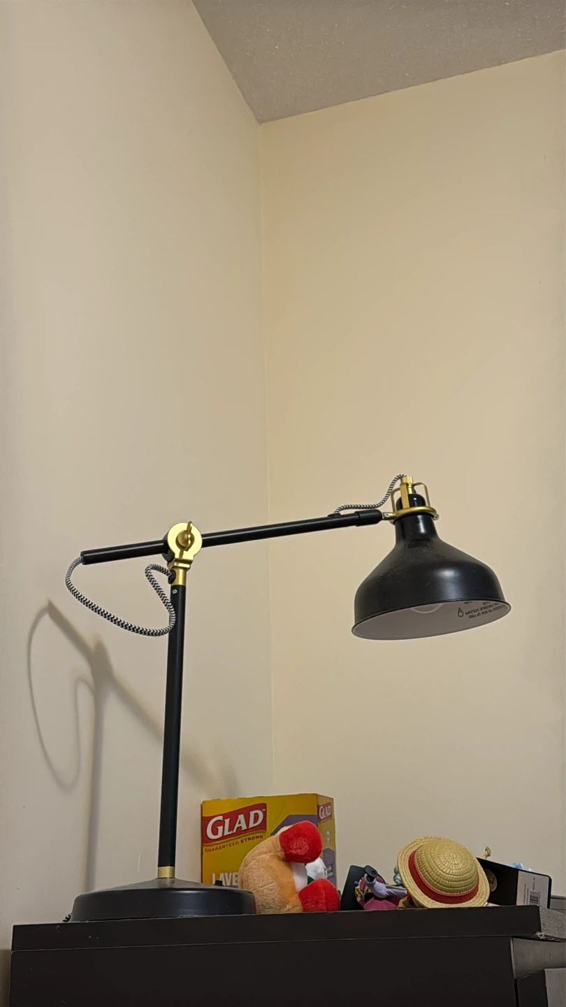 This is a black metal desk lamp featuring an adjustable arm and a classic shade. Its design allows for versatile positioning of the light. It's suitable for use on a desk or table.