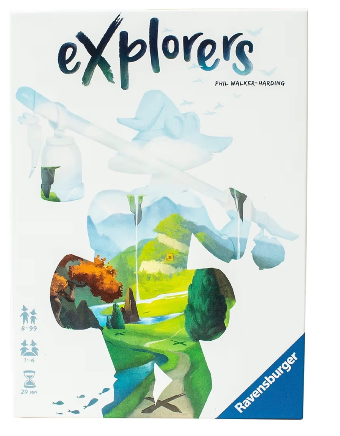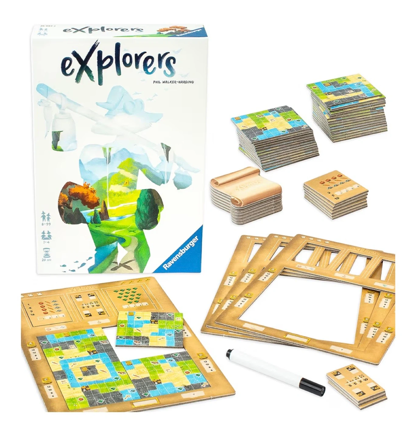 This Ravensburger Explorers board game is designed for 1-4 players and takes about 20 minutes to play. It's a simple, fast-paced flip & write game with over 1 million combination possibilities. Includes 4 player boards, 32 terrain tiles, 12 scoring tiles, and 4 markers.