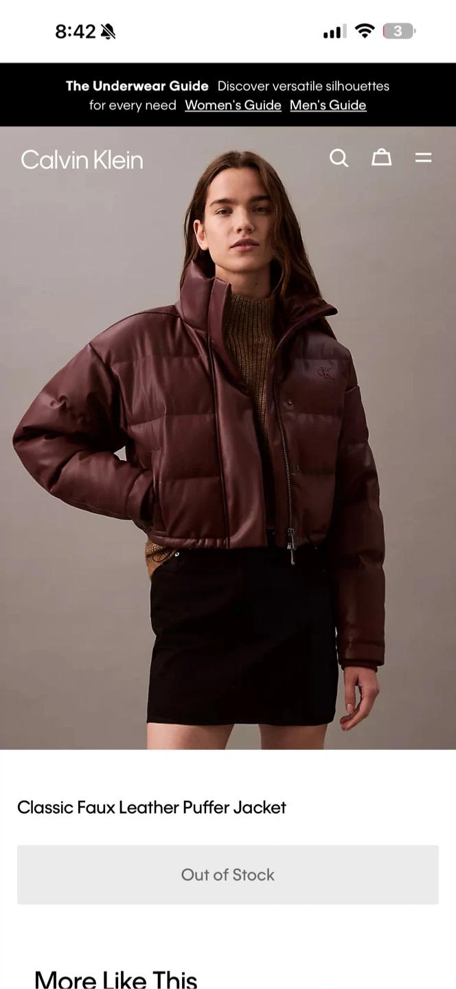 This Calvin Klein jacket is a classic faux leather puffer style. It's a cropped, boxy fit. The material is faux leather and it's insulated for warmth.