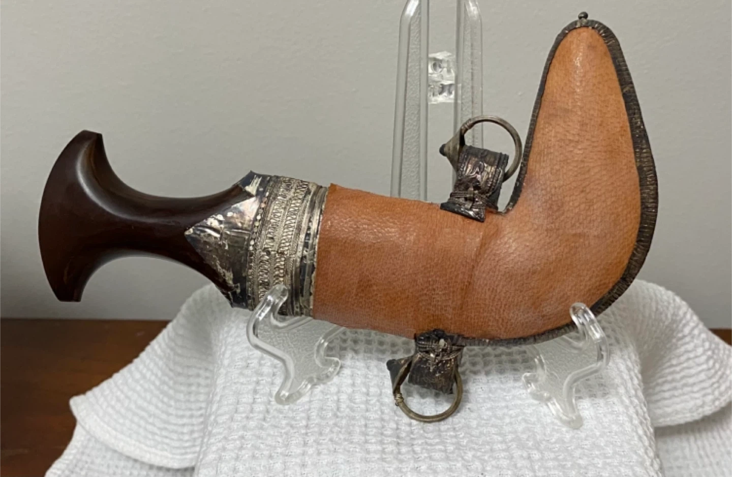 15Hand made and hammered 925 silver and leather back. From silversmith’s shop in Nizwa Oman. Due to app restrictions cannot show inside feature.