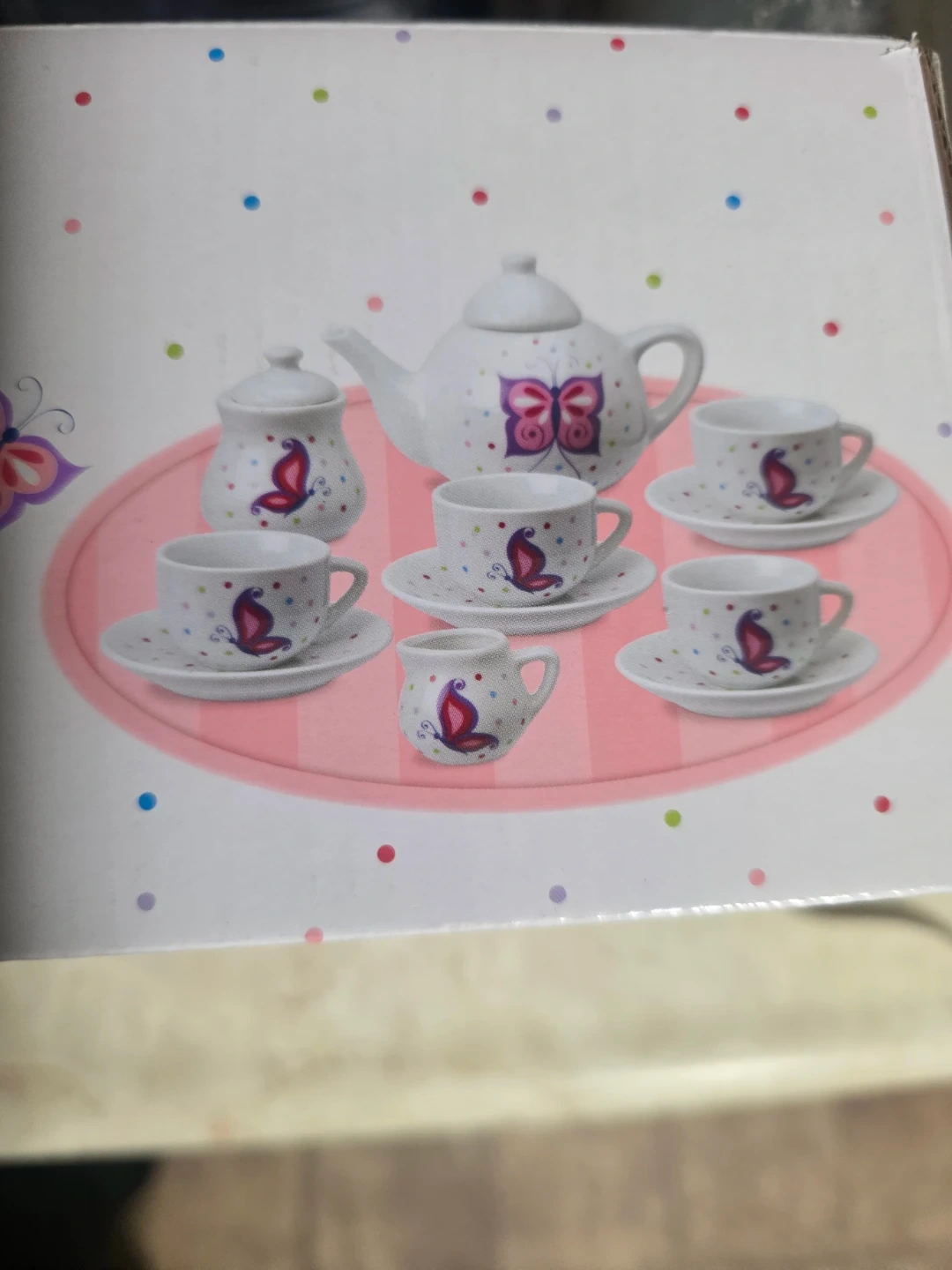 This is a 13-piece ceramic tea set for kids, featuring a "Chasing Butterflies" design. It includes a teapot, sugar pot, creamer, four teacups, and four saucers. Made from high-quality ceramic, it's perfect for imaginative play.