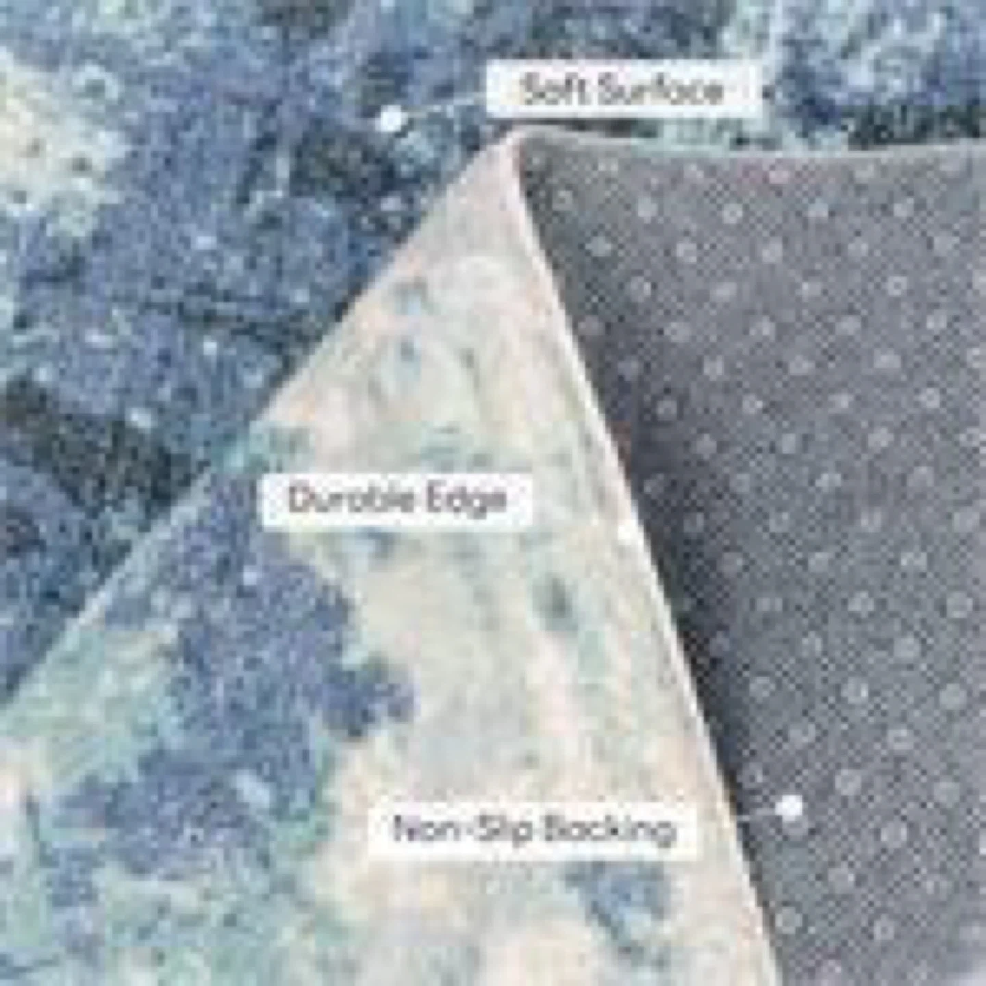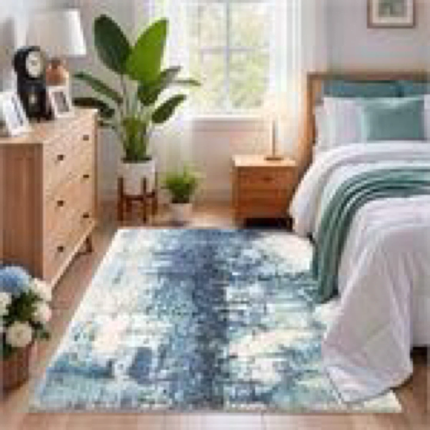 This area rug features a modern abstract design in blue and white tones. It has a soft surface with a durable edge and non-slip backing for safety. It's a great addition to living rooms or bedrooms!