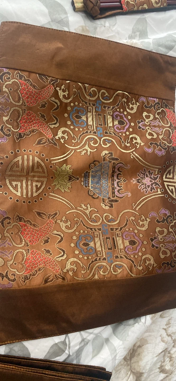 A set of six PLACEMATS featuring a beautiful ornate pattern in gold and brown tones. It also includes a set of six pairs of CHOPSTICKS with decorative holders. These would add elegance to any dining table! (NEW & UNUSED)
