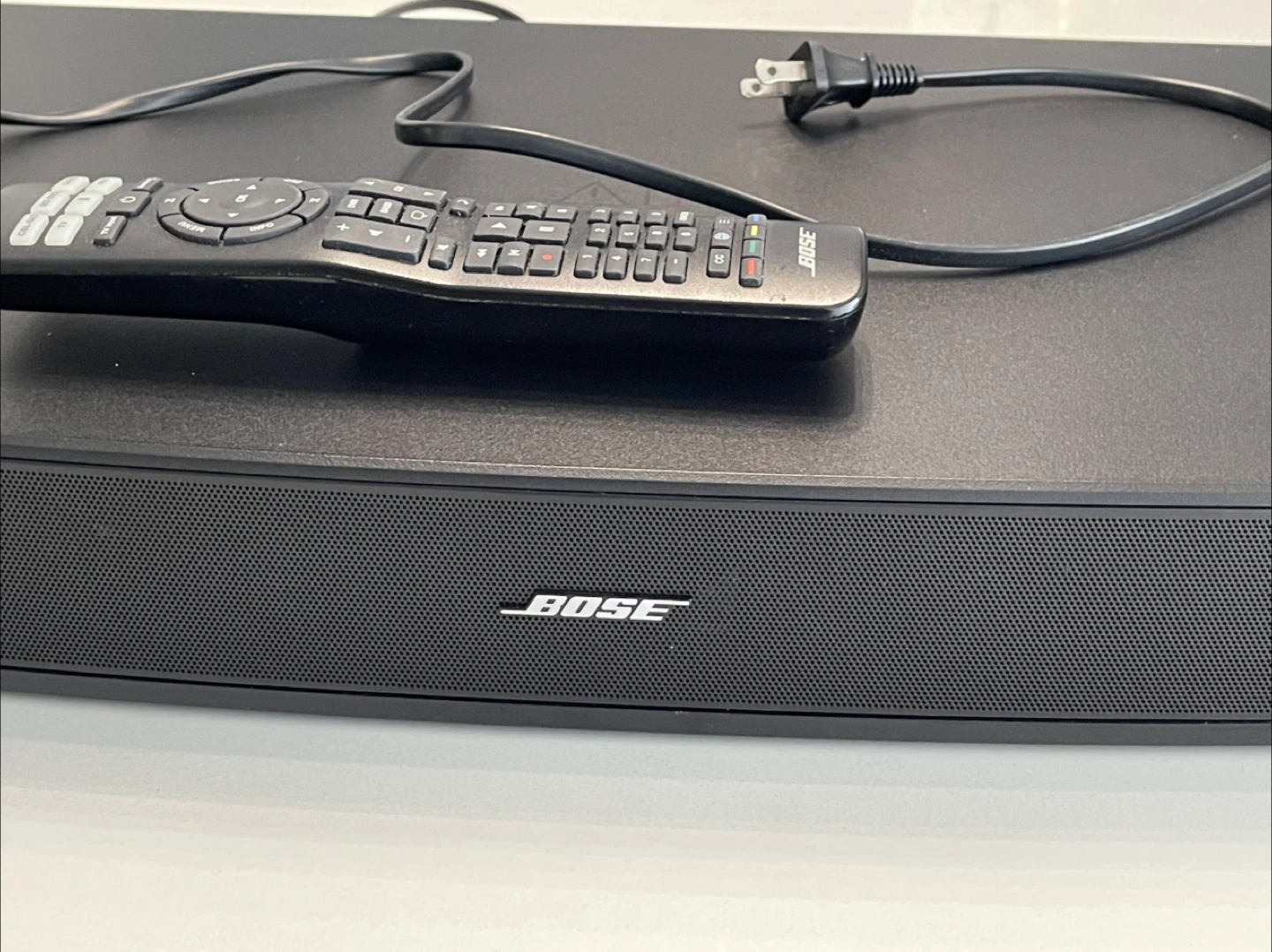 Selling a Bose Solo 5 TV soundbar in black. It's a great way to improve your TV's audio quality with clear sound. Comes with a remote control for easy operation and cables.