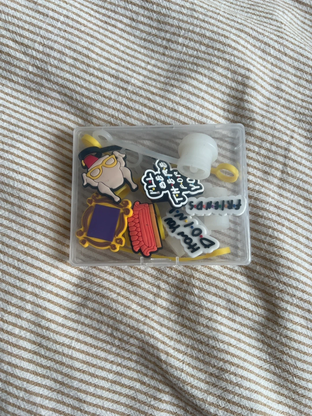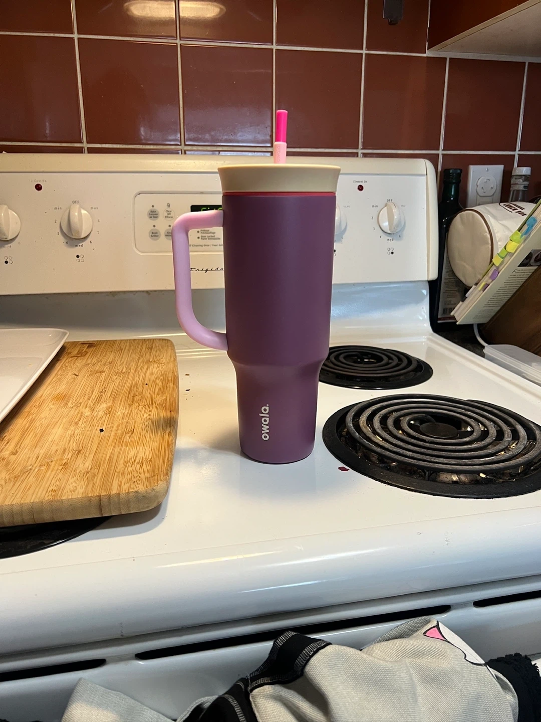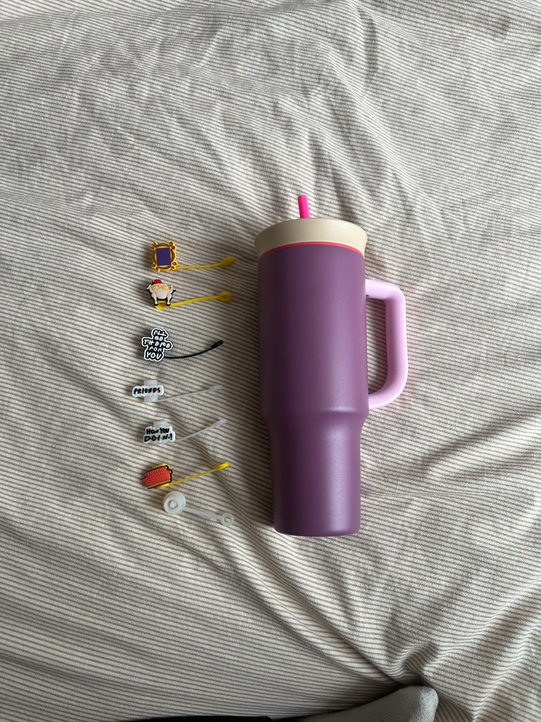 Owala FreeSip 40oz tumbler in purple with a pink handle and straw. It comes with several "Friends" themed charms and straw toppers, all in a clear storage case. Stainless steel construction.