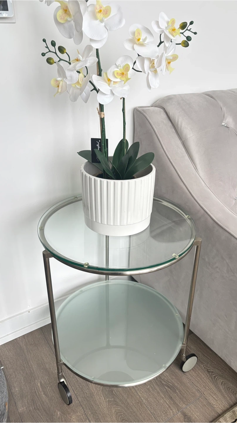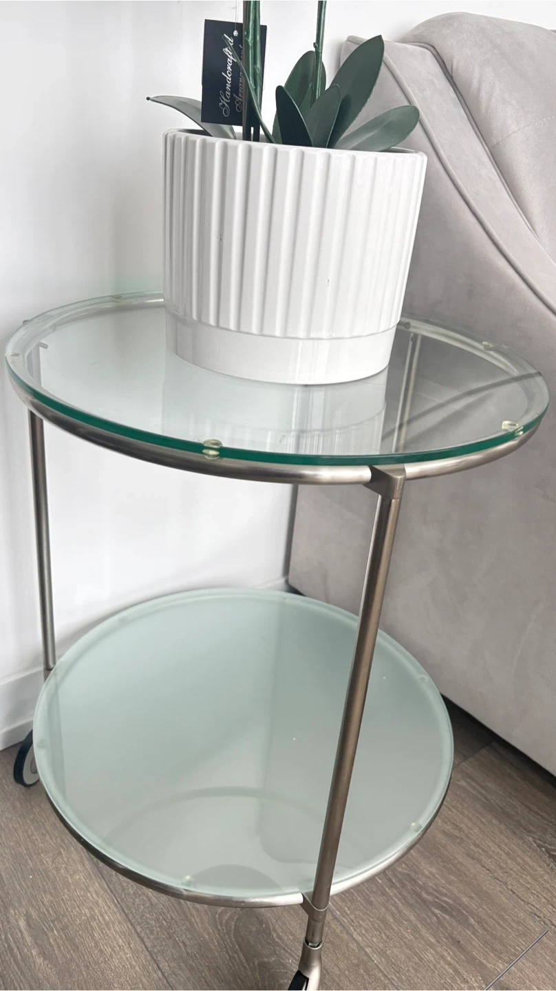 This is a handy two-tier side table with a glass top and bottom shelf. It's got a metal frame and wheels for easy moving. The top shelf is clear glass, and the bottom shelf is frosted glass.
