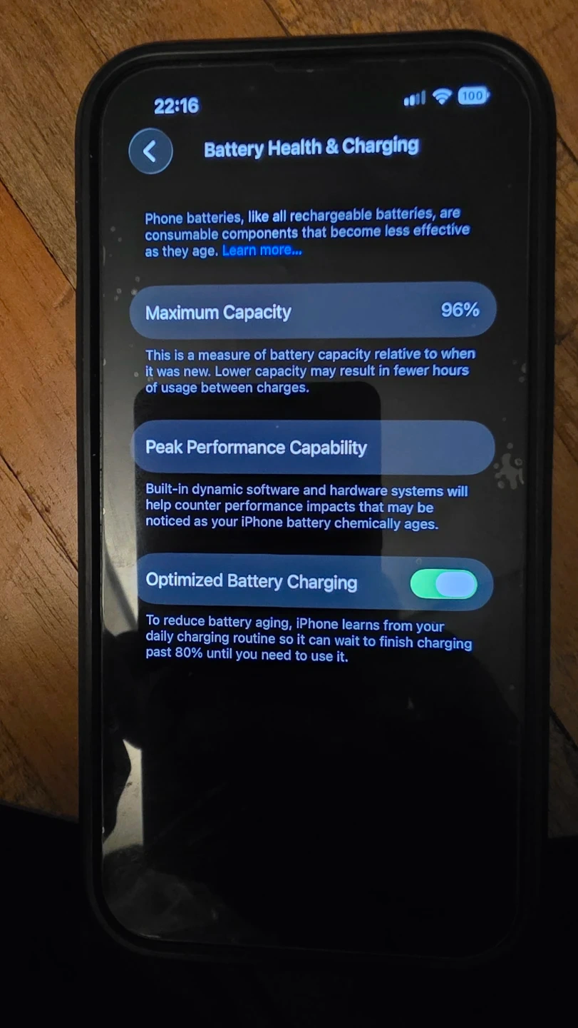 Excellent condition iPhone 13 with 96% battery health. It's the 128GB model in black. Optimized battery charging is enabled to help preserve battery life. A great phone for everyday use and beyond!