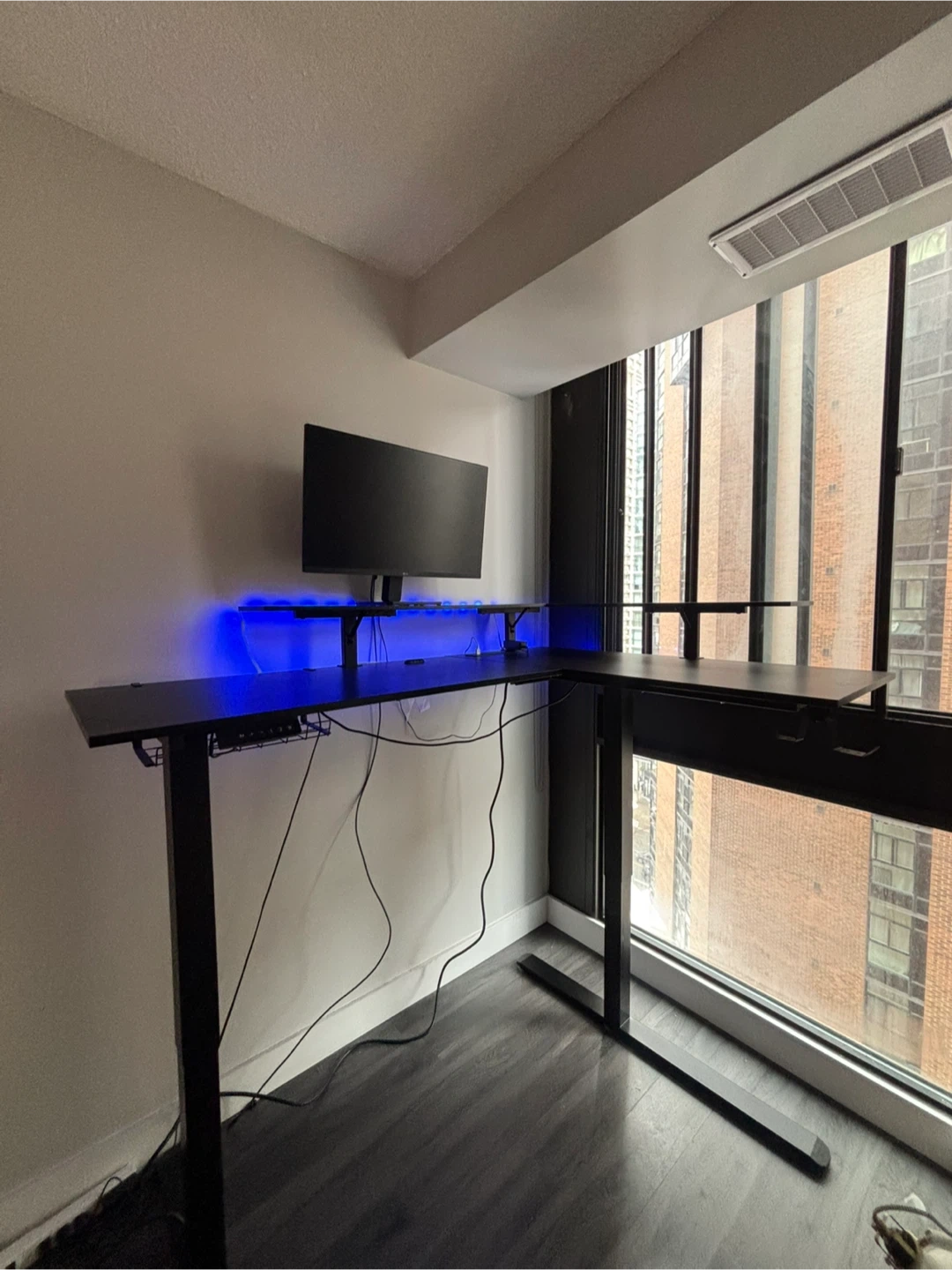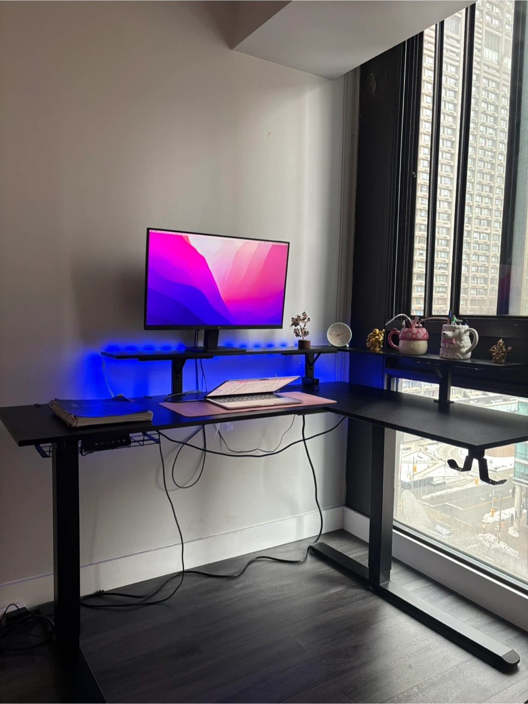 This L-shaped standing desk offers adjustable height settings for ergonomic comfort. It features a built-in monitor stand and cable management system. The black finish complements any modern workspace.