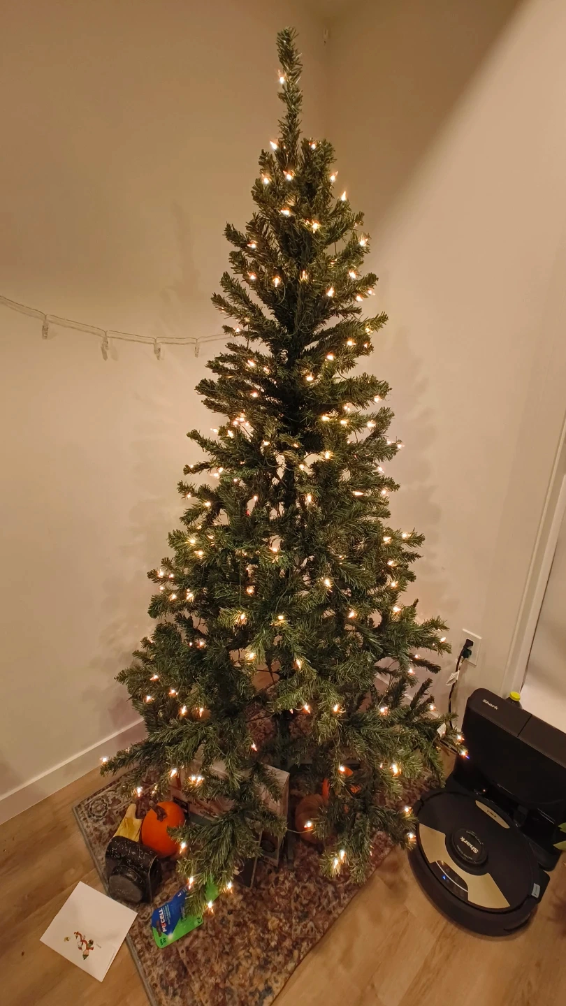This is a pre-lit artificial Christmas tree. It's ready to be decorated for the holidays. The branches are full and it comes with built-in lights.