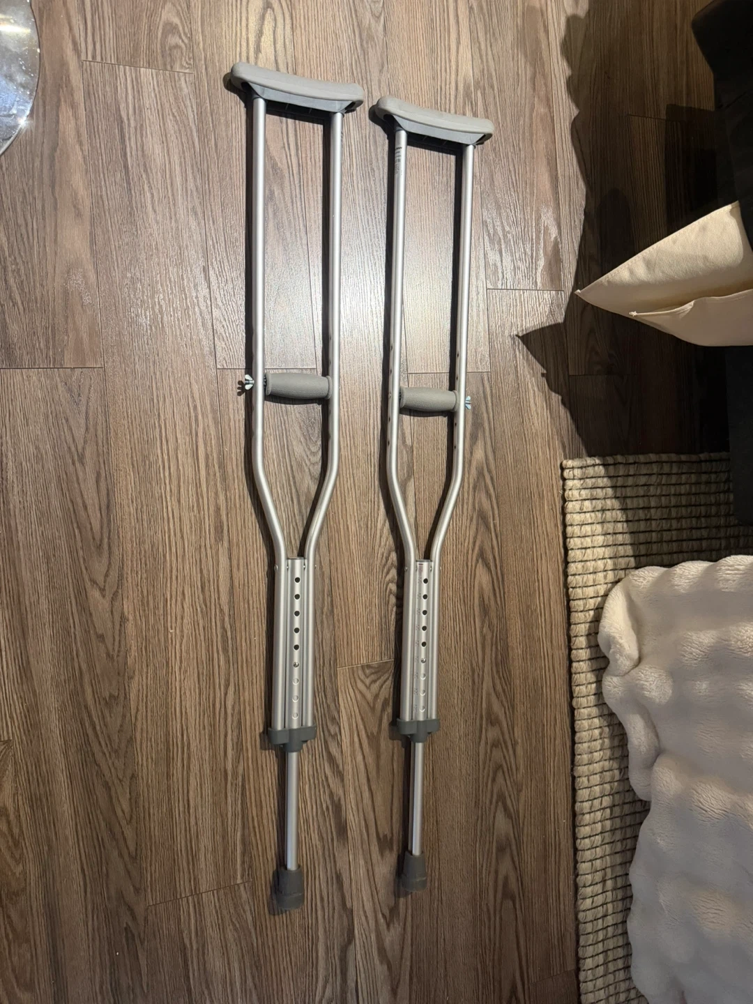 Selling a pair of adult adjustable crutches that the hospital charged me $50 for and I used for a total of 5 minutes. They're made of aluminum and have comfortable hand grips. Adjustable height.