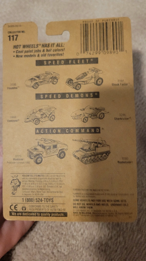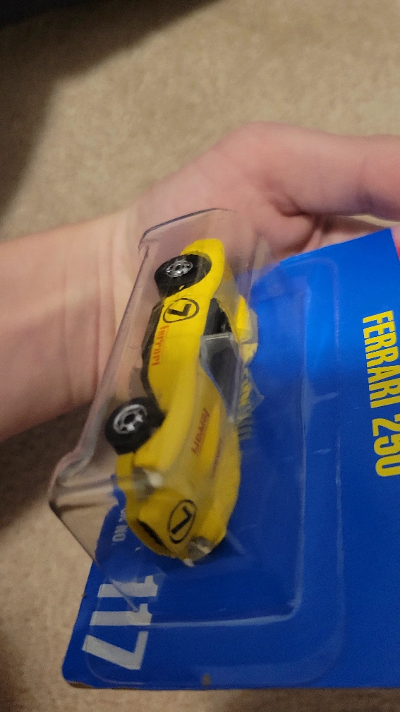 Yellow Ferrari 250 die-cast metal toy car. Collector number 117. Part of the Speed Fleet series. In original packaging, shows some minor wear. Very old and rare.