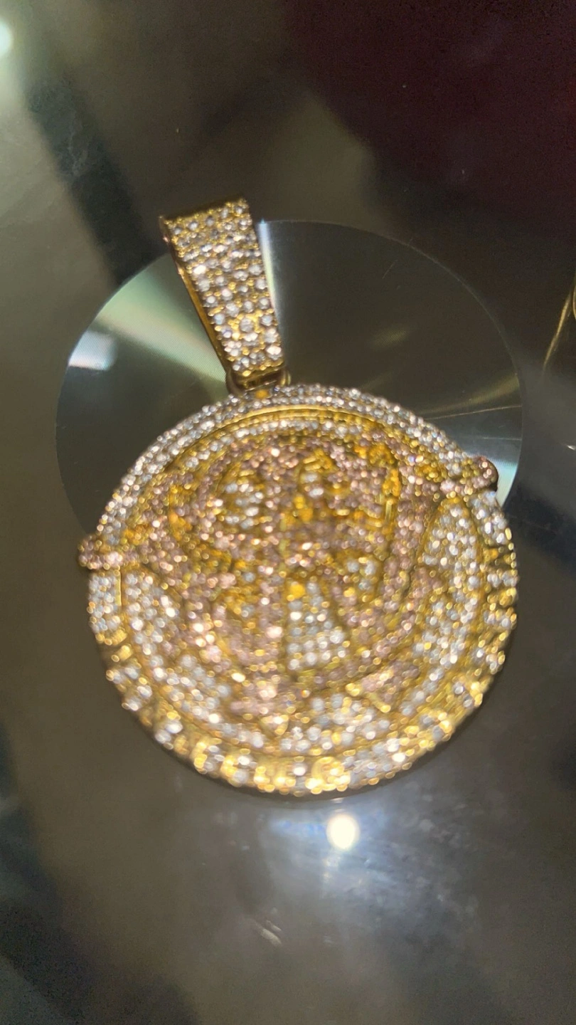 This eye-catching pendant features a detailed Medusa head design, encrusted with sparkling diamonds. It's crafted from gold and offers a bold statement piece.