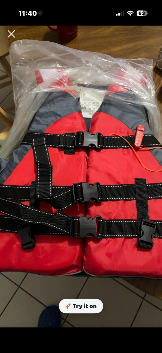 This life jacket is red and grey. It has multiple adjustable straps with buckles for a secure fit. A safety whistle is included and attached to the jacket.