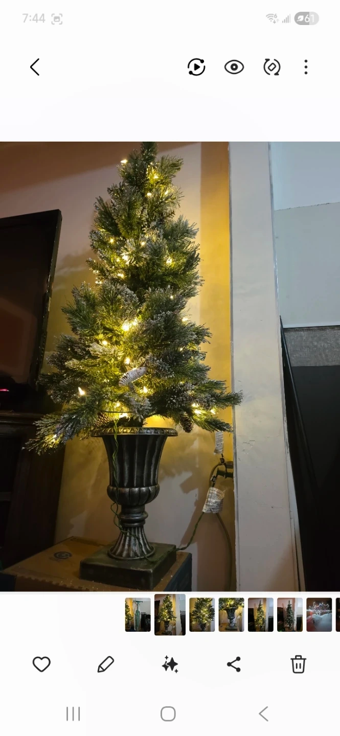 A festive pre-lit artificial Christmas tree, adorned with pinecones and lights. It's housed in a decorative dark grey urn planter, perfect for adding holiday cheer. This tree adds a lovely touch to any indoor space during the Christmas season!