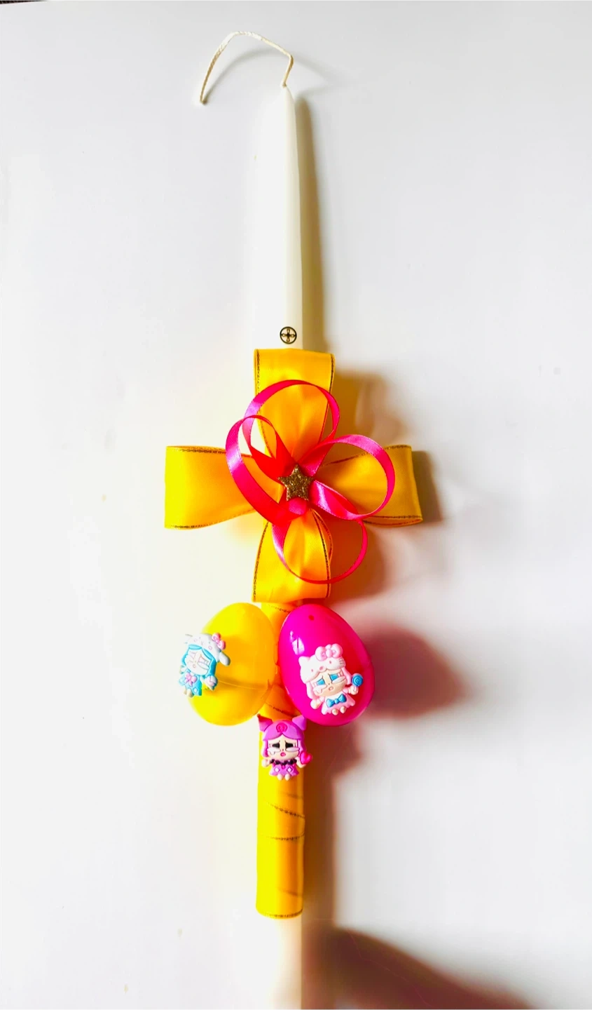 It features two decorative Easter eggs, one pink with a Hello Kitty design and one yellow with a blue character. Also includes small character charms. Perfect for Easter celebrations!🐣♥️✨