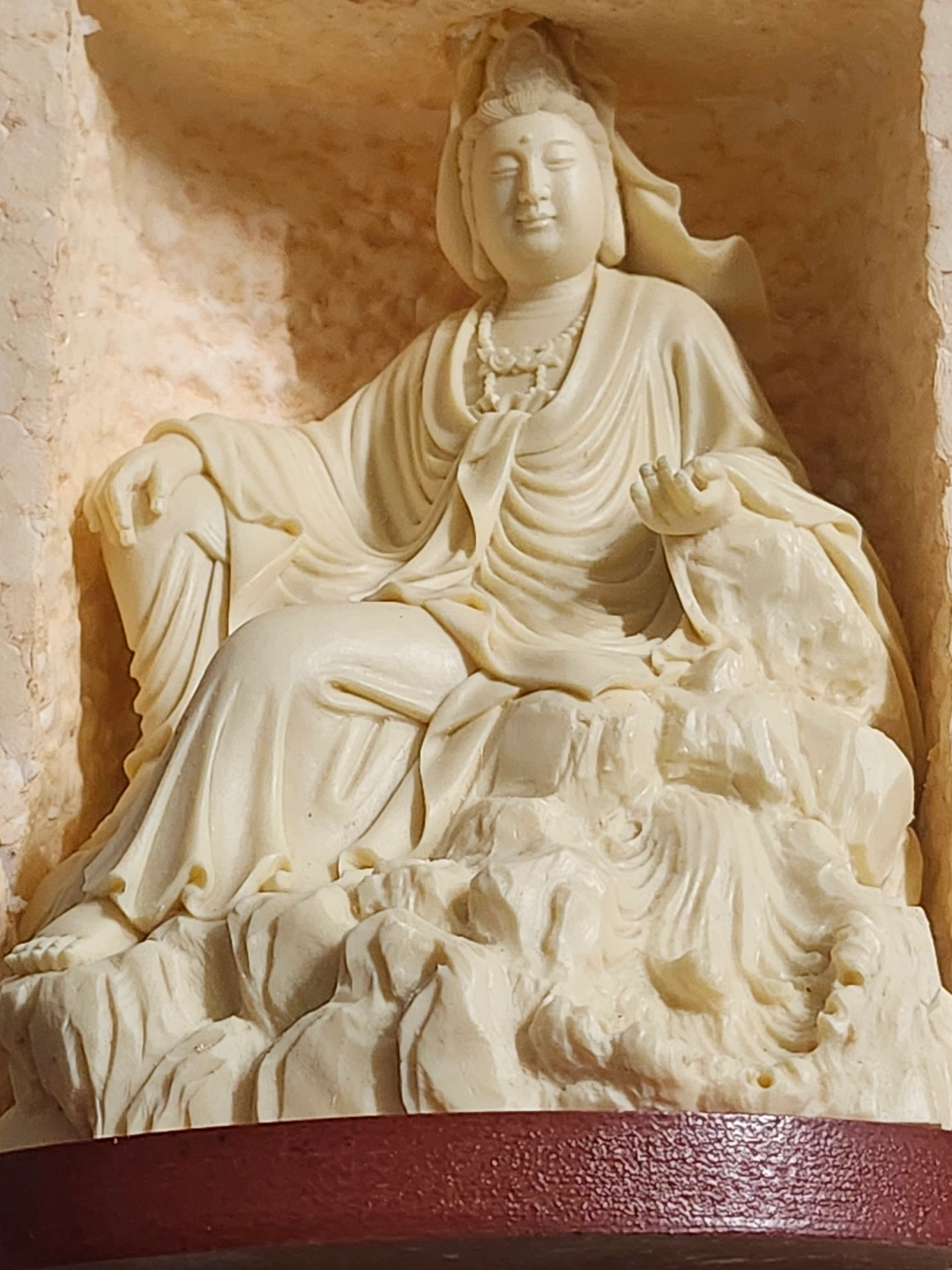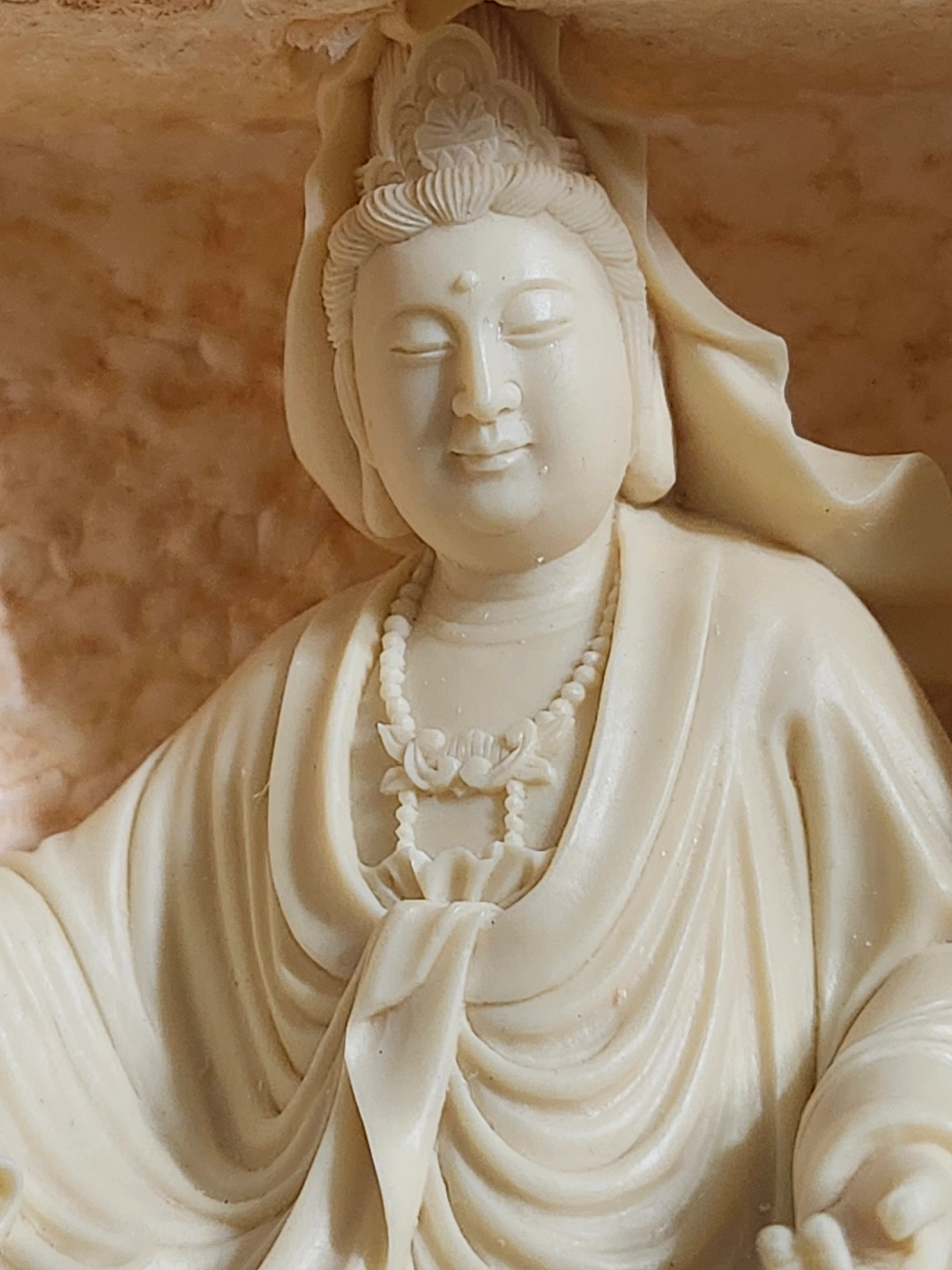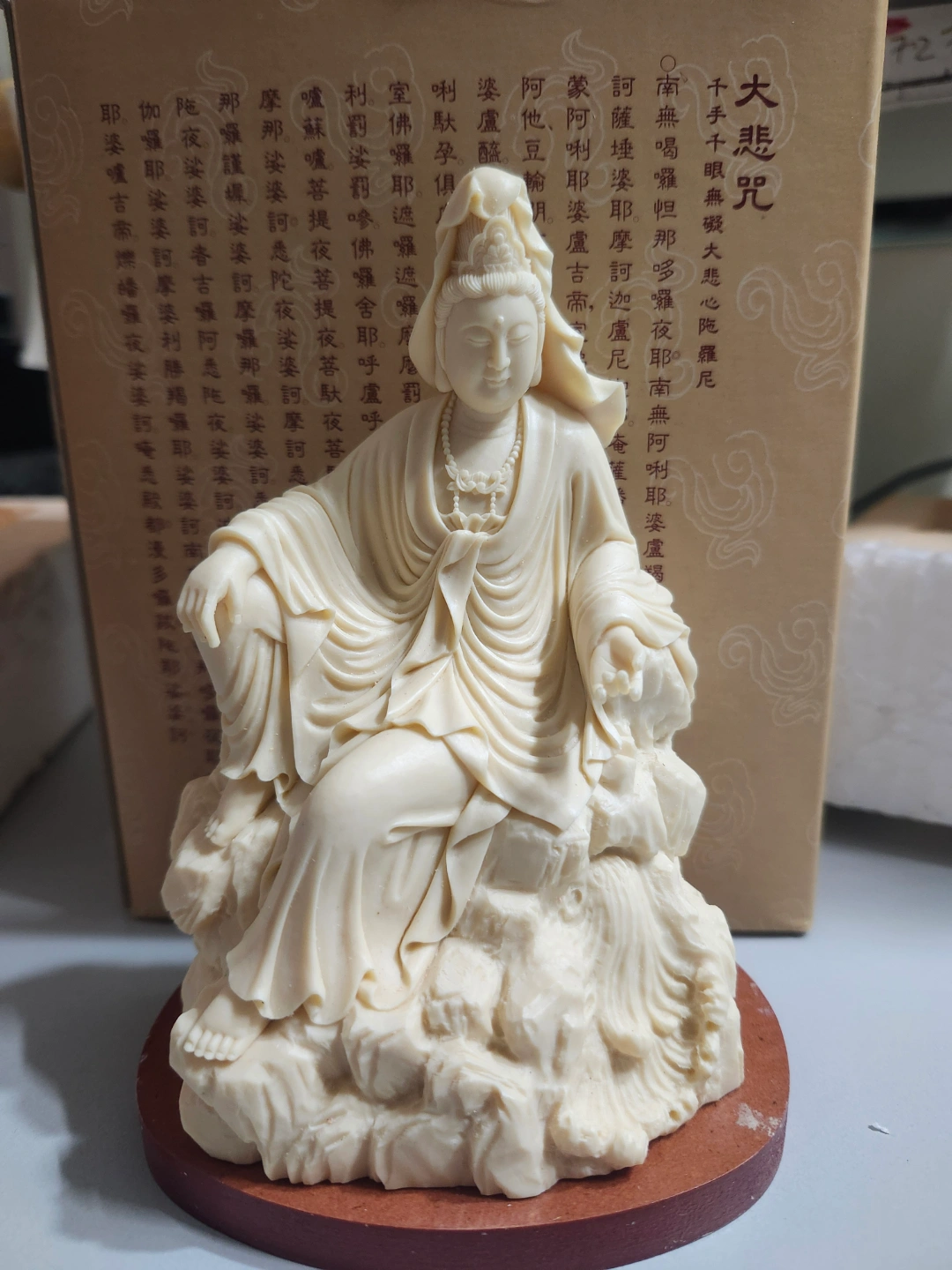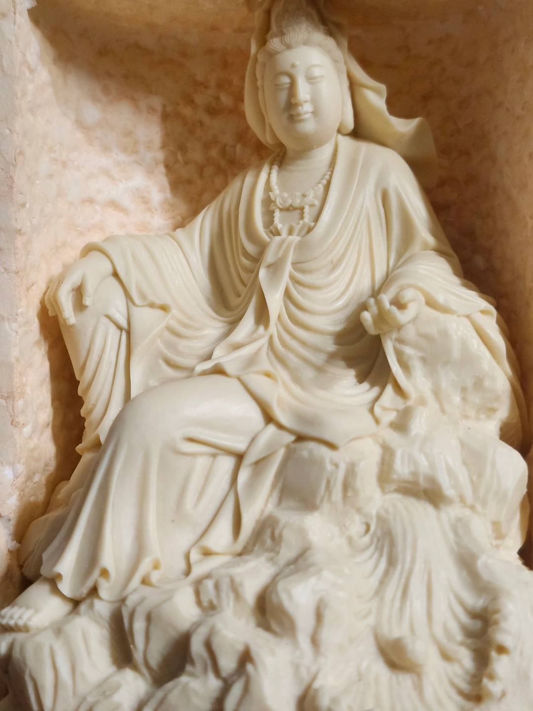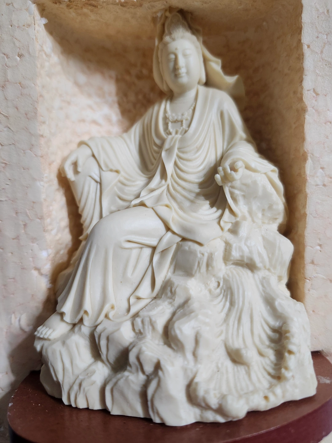 Beautiful off-white Guan Yin statue. Intricate detail. Seated pose. Collectible figurine. Perfect for display.