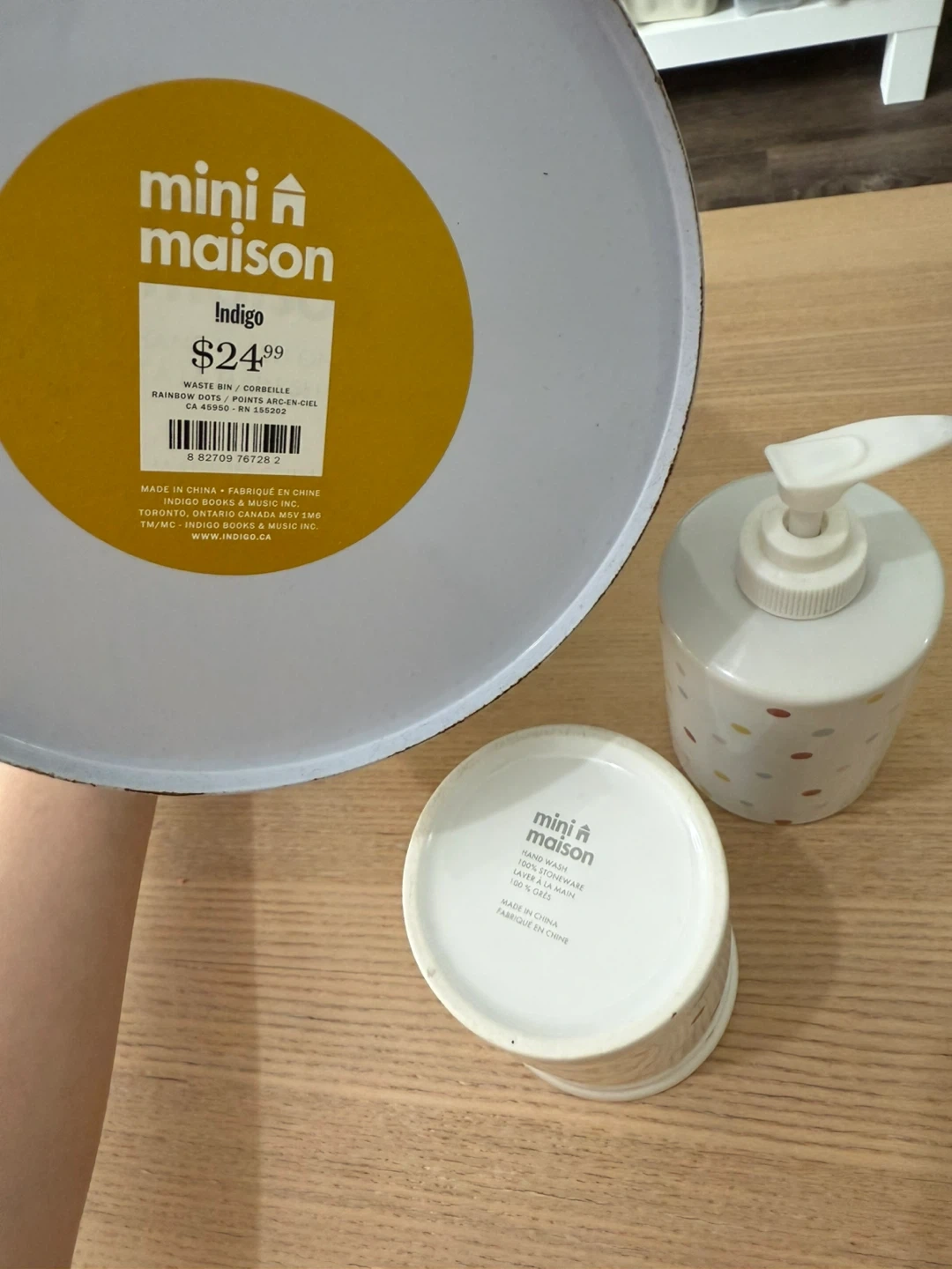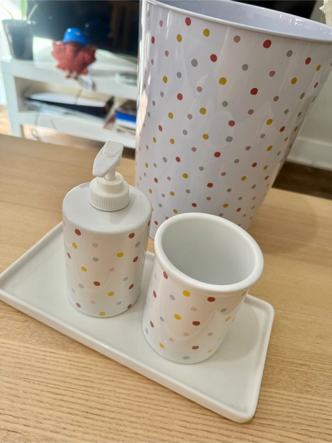 This set includes a soap dispenser, a cup, a tray and a bin. Set was purchased from Indigo.