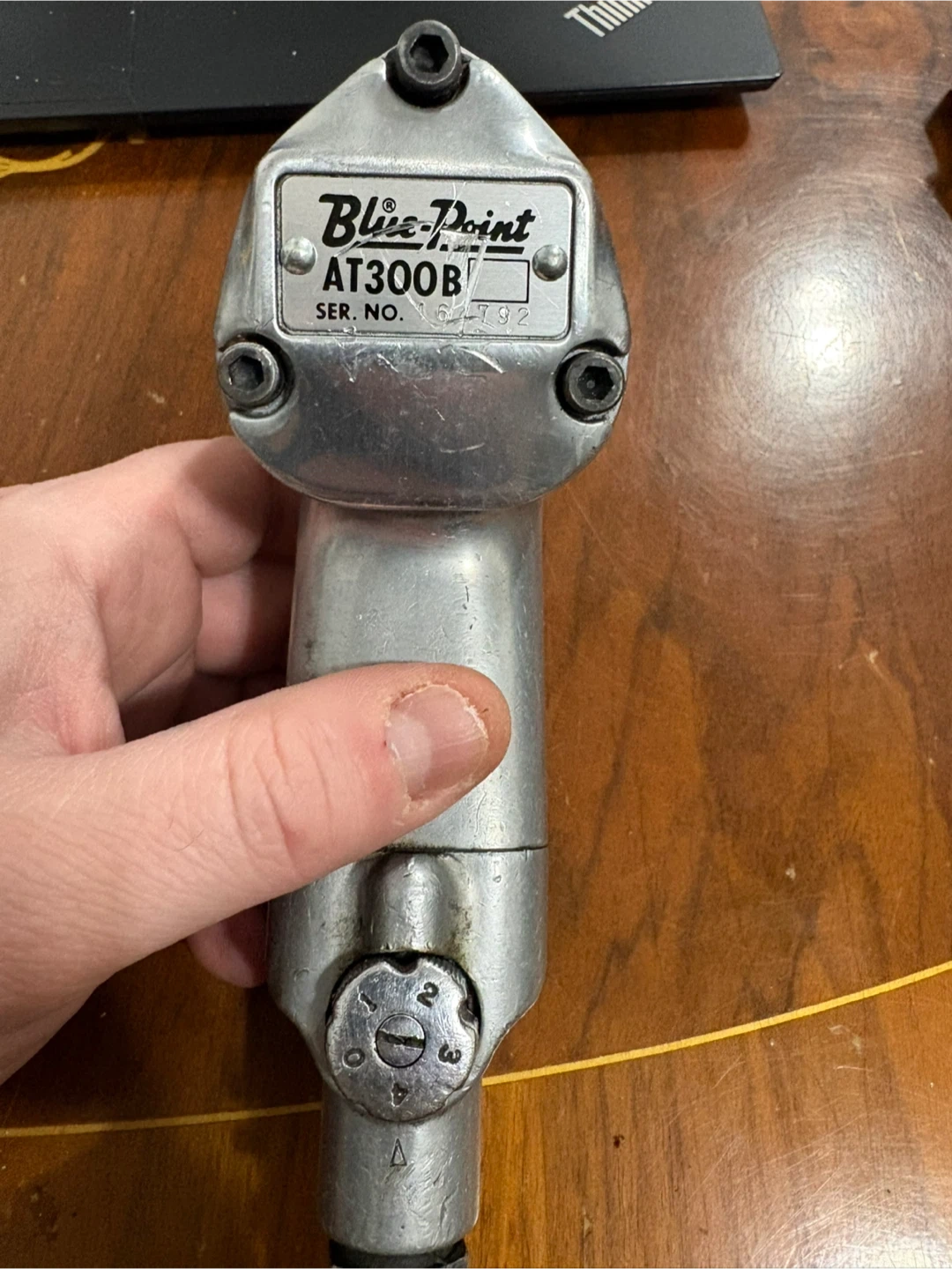 Blue-Point AT300B air ratchet wrench. Features a metal body with a trigger handle. Includes air hose fitting. It's a handy tool for tight spaces!
