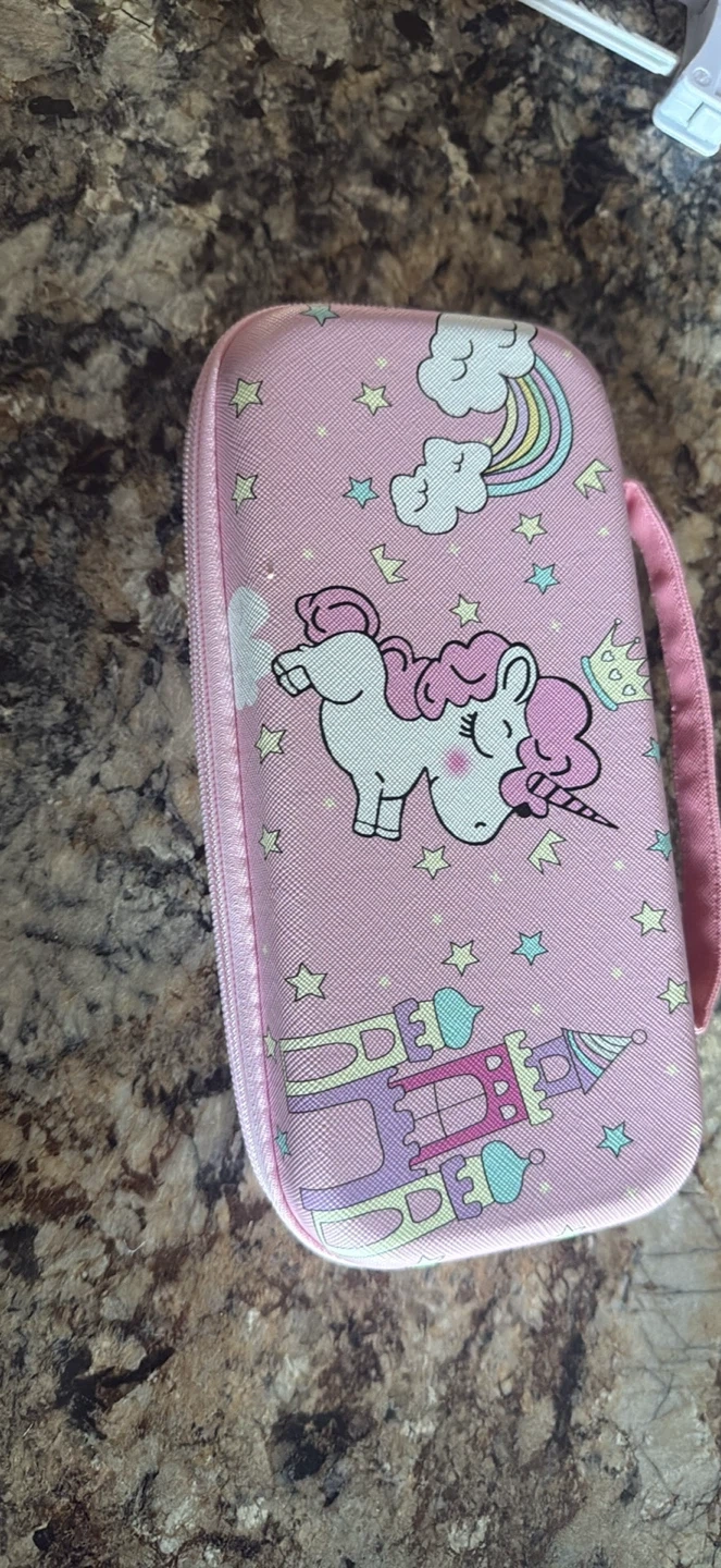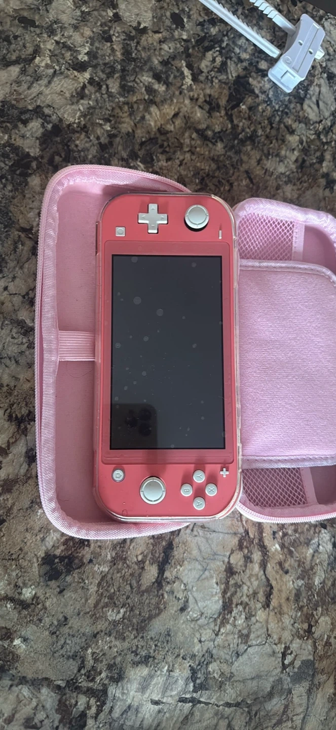 Coral Nintendo Switch Lite gaming console! It's in its pink unicorn case, which has a soft interior to keep it protected. This setup is ready for gaming on the go. Great for young gamers!