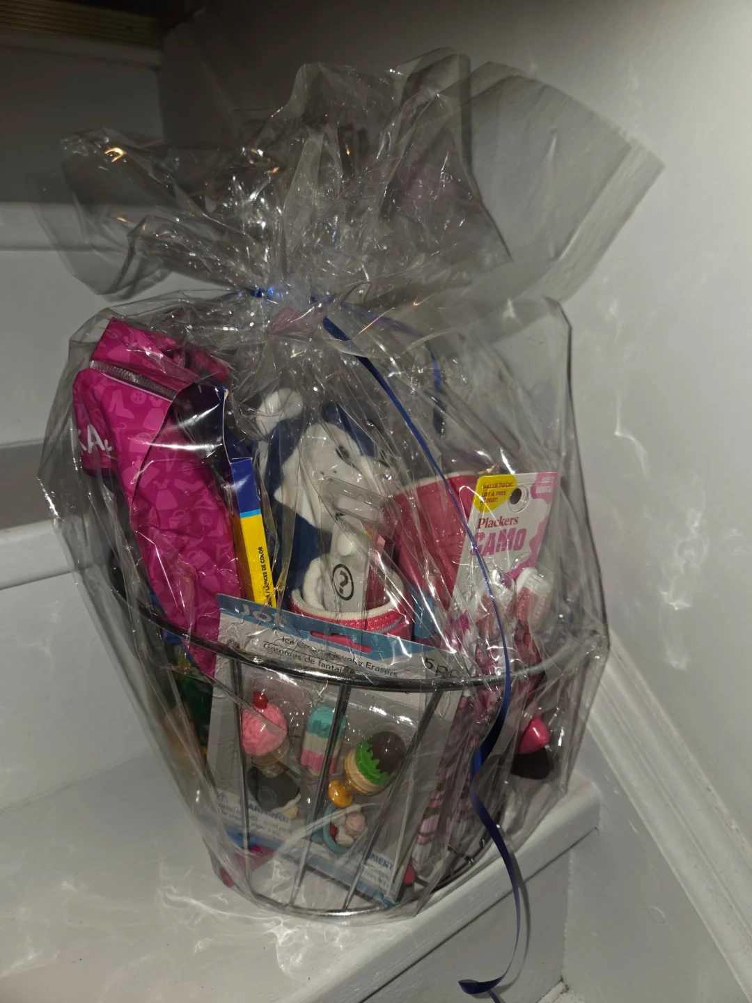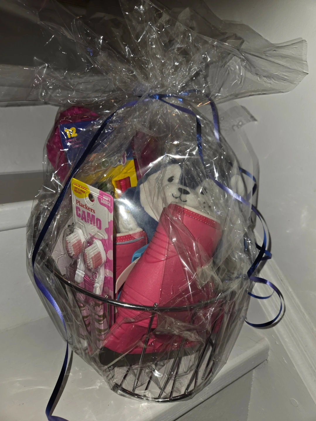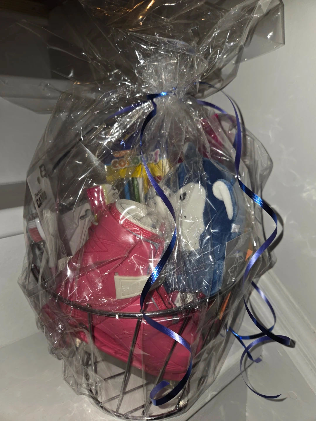 This gift basket is packed with toys and essentials for a child. It includes "Fashion Poupee Mode" items, a stuffed animal, pink ice skates, and oral hygiene products like toothbrushes and crafts. It's a fun assortment for a young one!