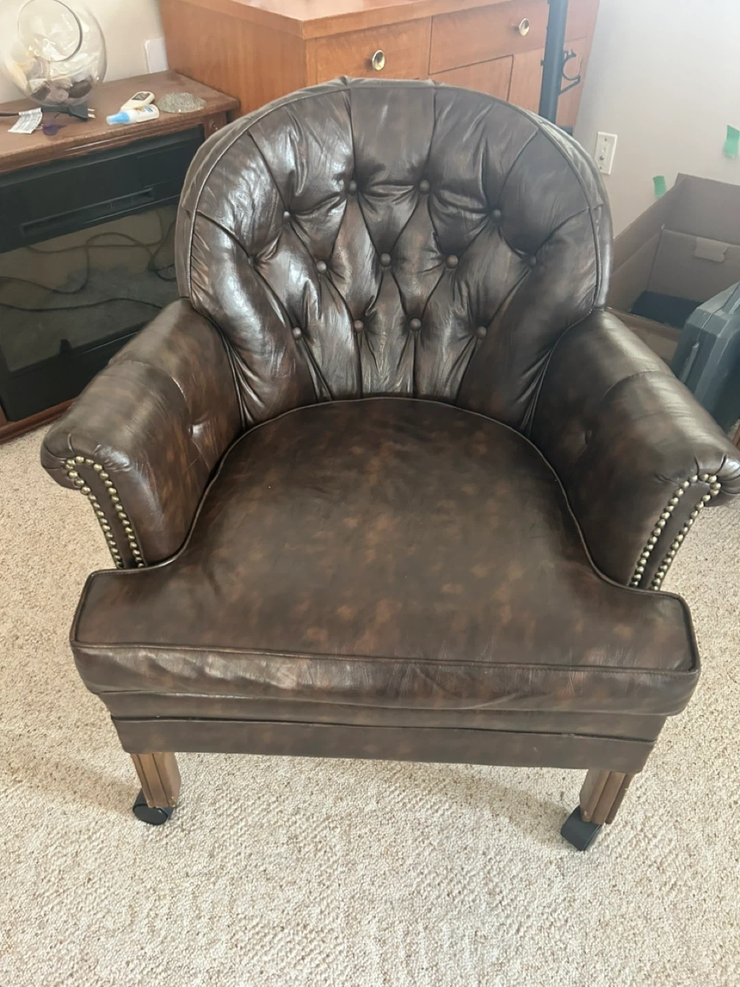 Brown Tufted Leather Armchair with Wheels