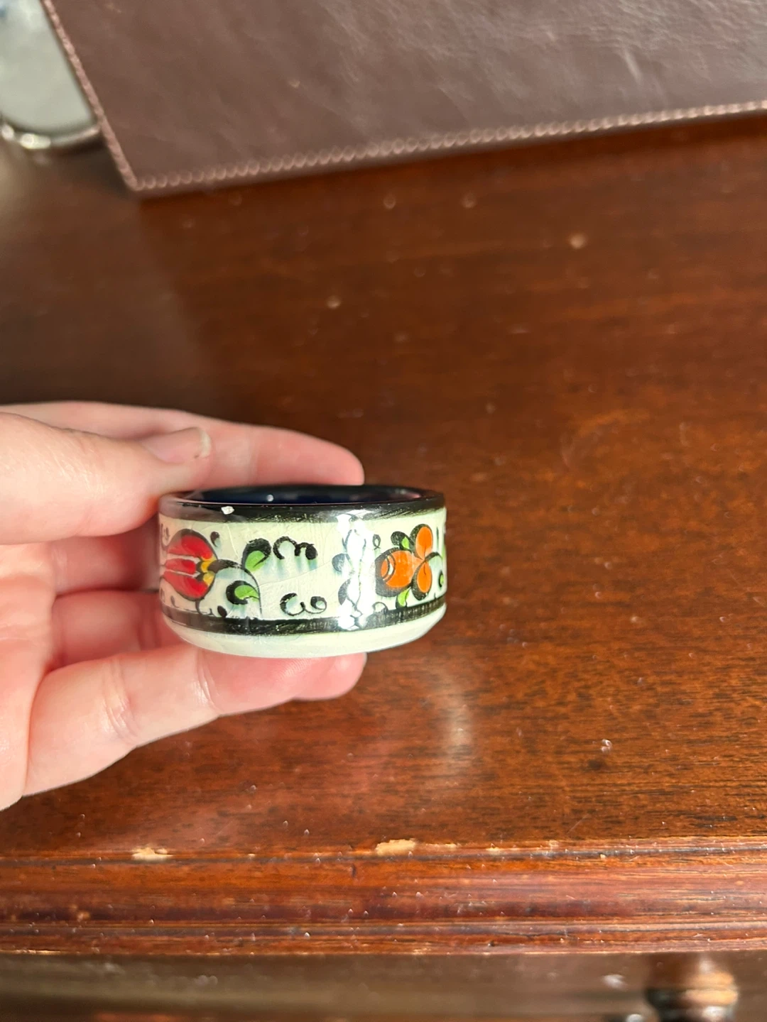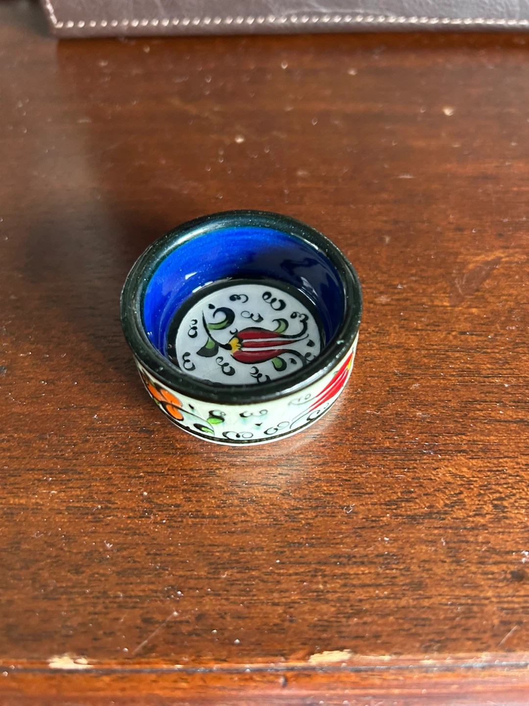 This is a small, handmade ceramic dish from Budapest. It's decorated with a colourful floral pattern. Useful for holding small jewellery or trinkets.