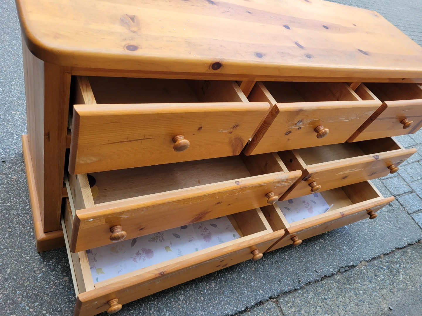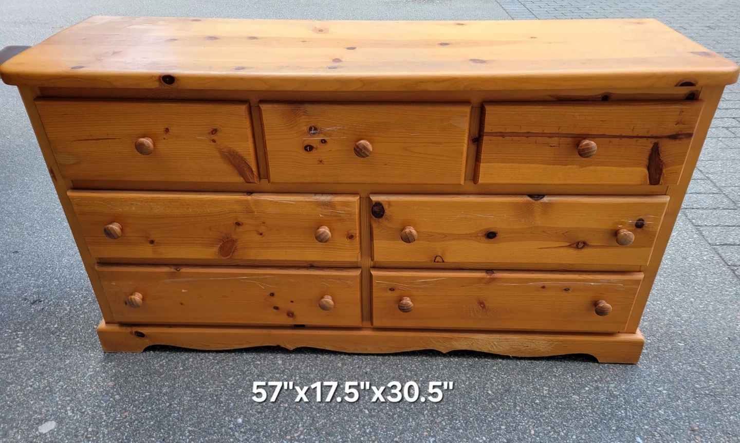Wooden dresser with seven drawers. Dimensions are 57" W x 17.5" D x 30.5" H. Some tape residue visible on the wood. Delivery available if needed. Let me know if you are interested. Thanks.