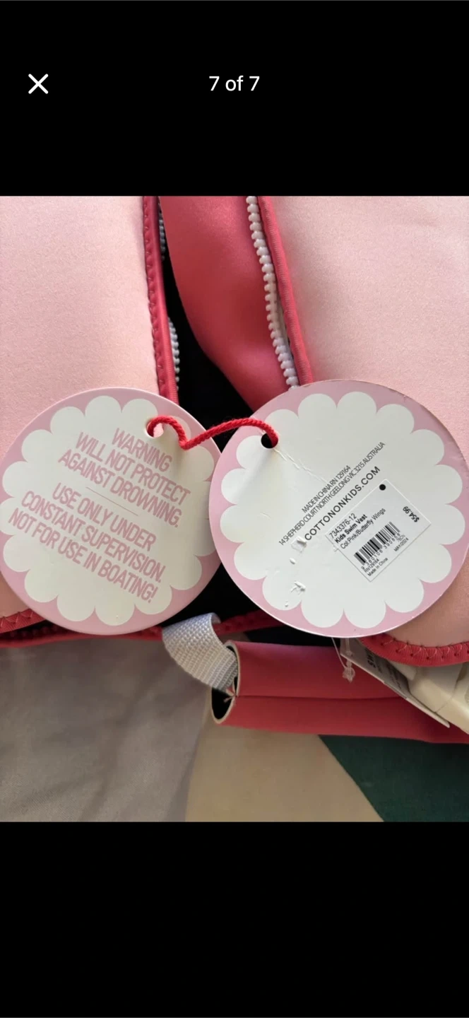This pink swim vest is for ages 4-6 years and up to 30kgs. It's made of neoprene and polyester. It has a cute butterfly design on the back . Smoke free pet free home . Pick up 551 Emerson street . Coquitlam . Cash only.no delivery