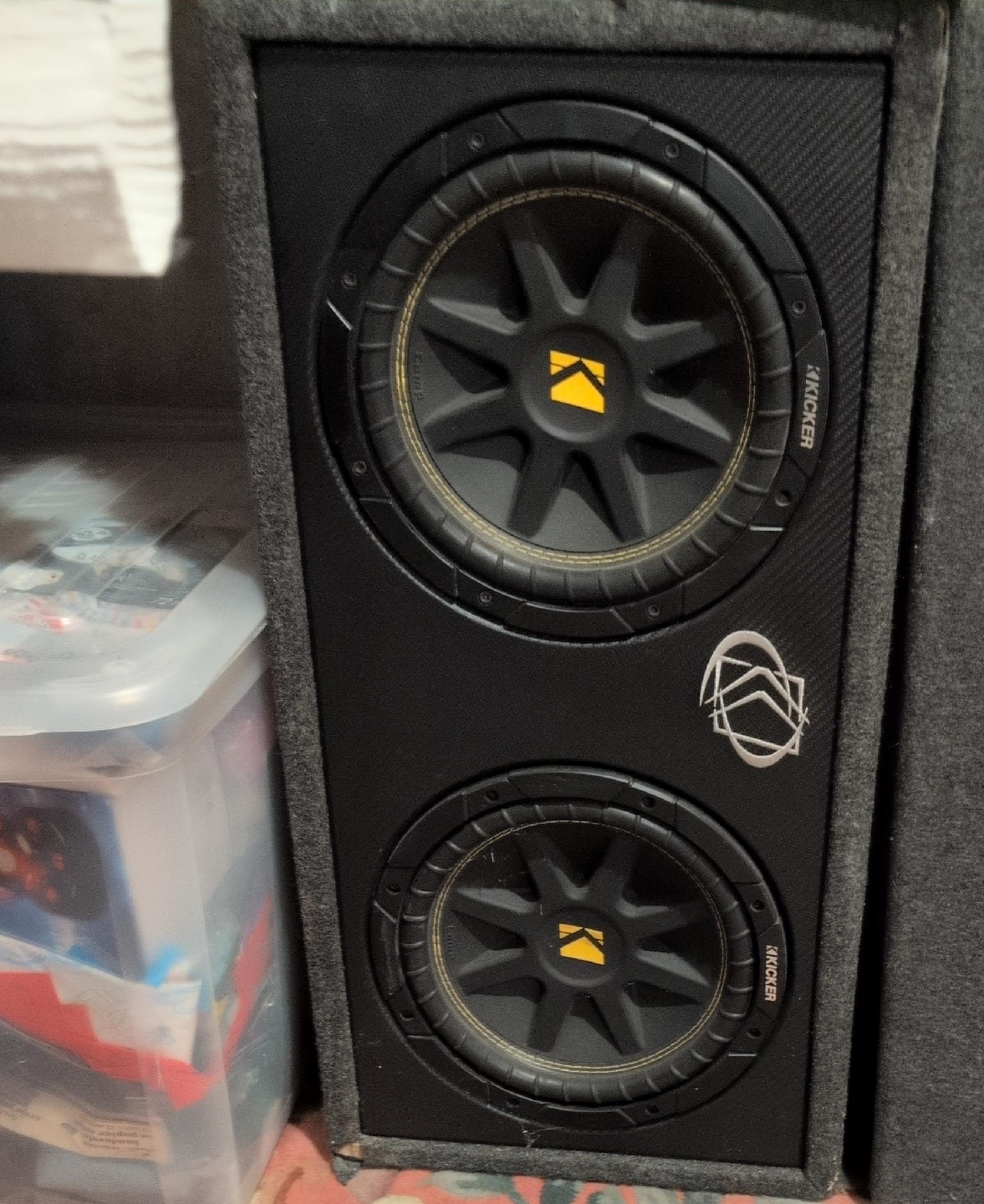Selling a Kicker dual subwoofer speaker box. It's in good condition and ready to boost your car audio! Perfect for anyone looking to upgrade their sound system