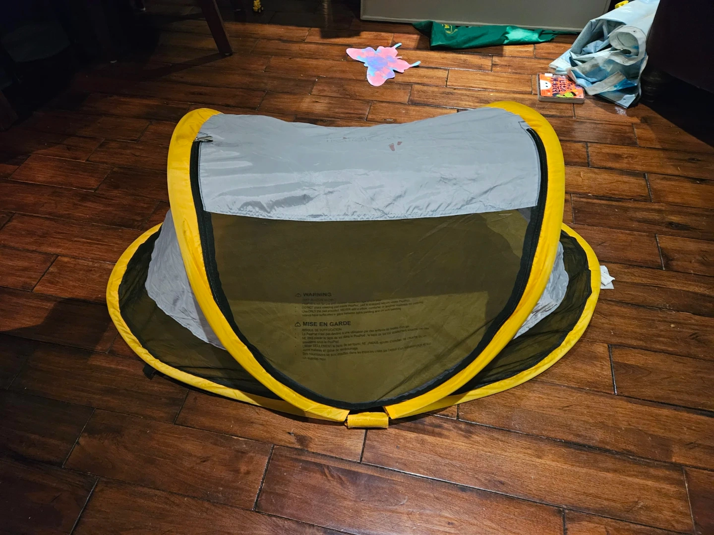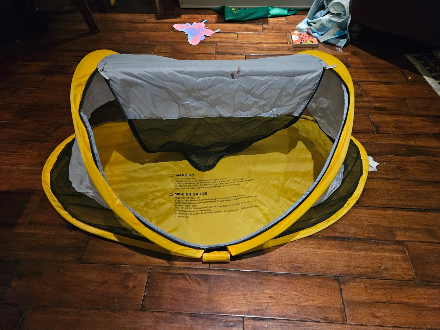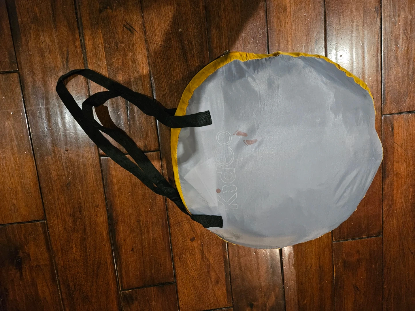 0Kidco peapod travel tent. We love this tent for traveling and camping. Fits kids up to three years old. Packs away into a very small package. Great for helping your little one have a cozy contained space. Includes cozy mattress underneath for comfort.