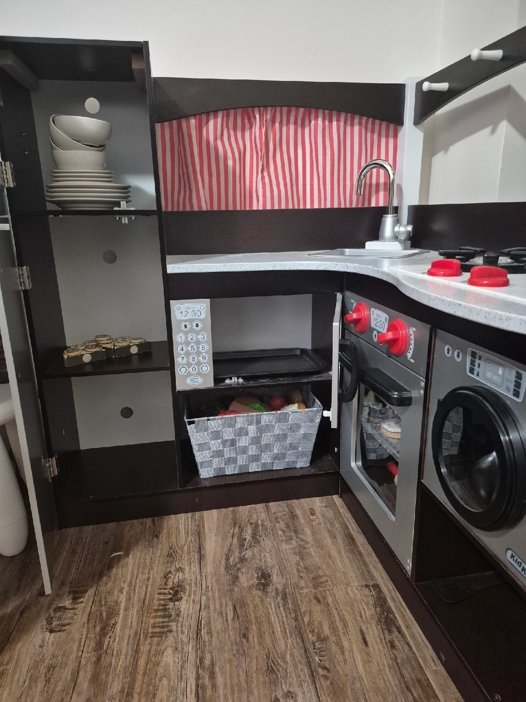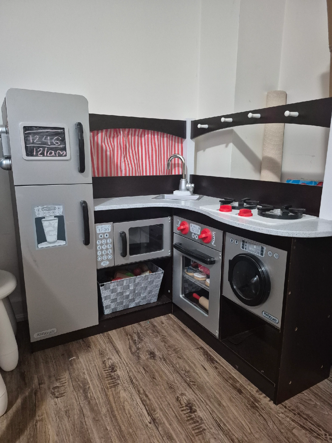 This KidKraft corner kitchen playset is perfect for your little chef! It includes a sink, stove, oven, microwave, and refrigerator, providing hours of imaginative play. The corner design maximizes space, making it a great addition to any playroom