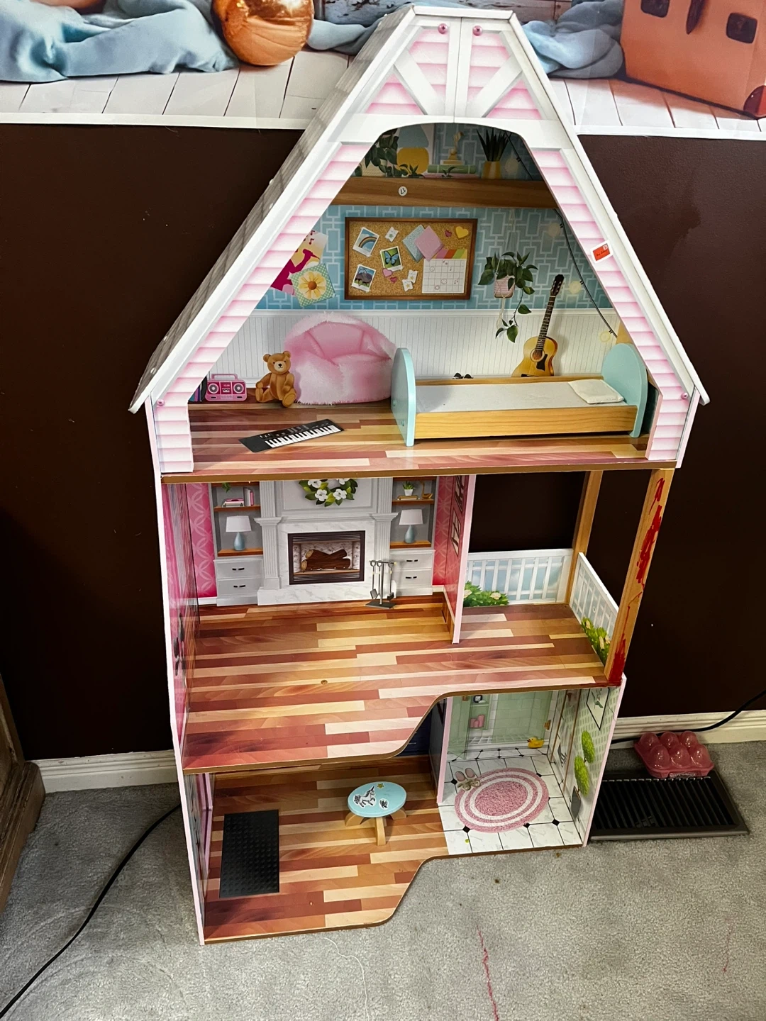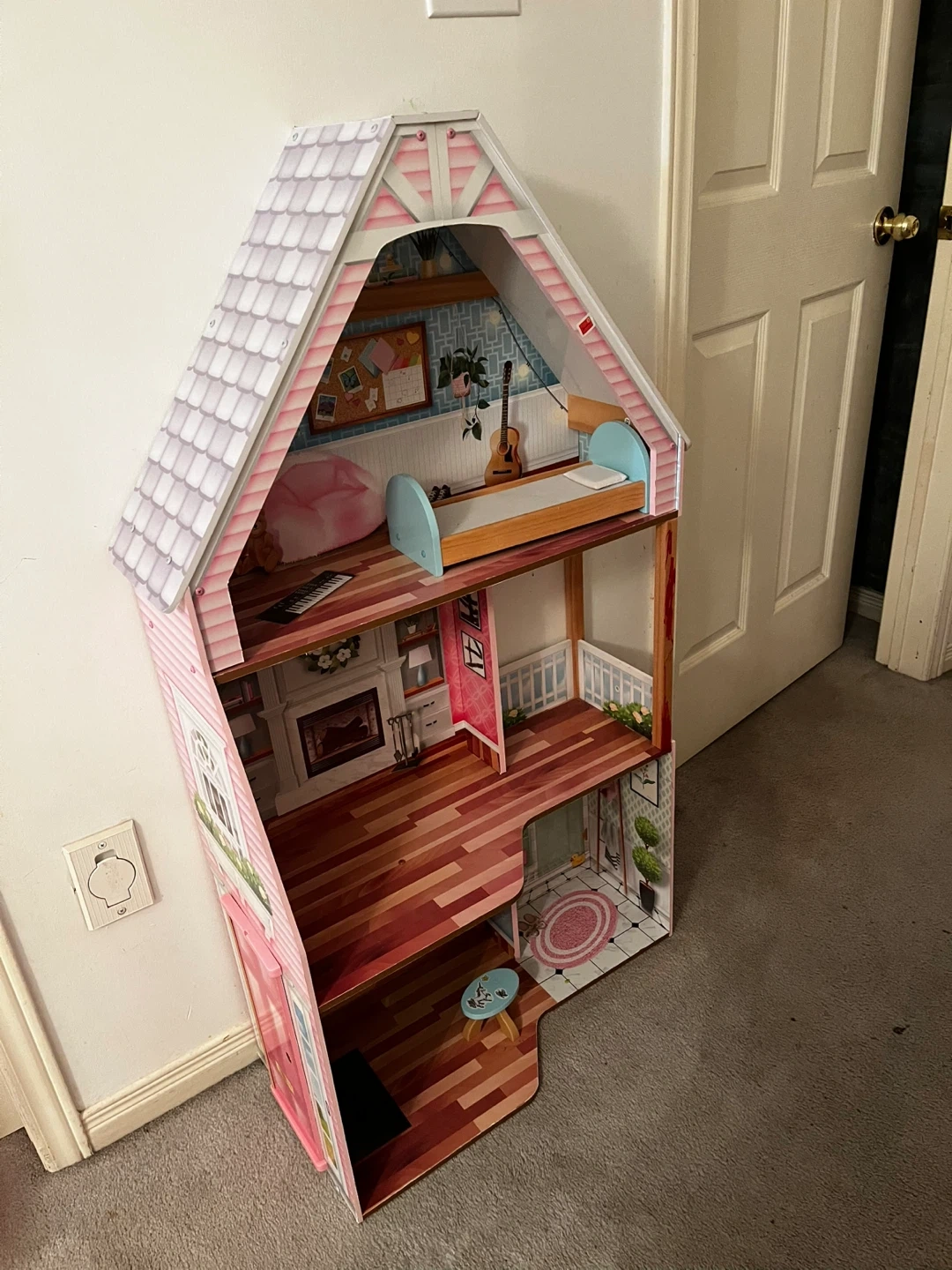 23Selling a lovely KidKraft dollhouse in good condition! It's pink and white, and ready for a new family of dolls to move in. It has multiple levels for hours of fun! A door to open and lots of fun interior to use imagination to be as creative as possible. Comes with a bed and table.