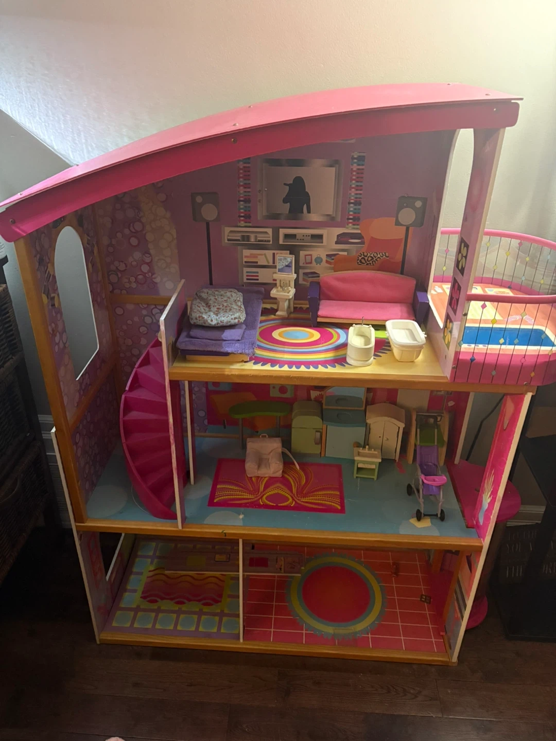 12Selling a cute KidKraft dollhouse! It features multiple rooms and levels, including a living room, kitchen, bedroom, and even a rooftop patio. Perfect for imaginative play and doll adventures! Comes as seen in the photos