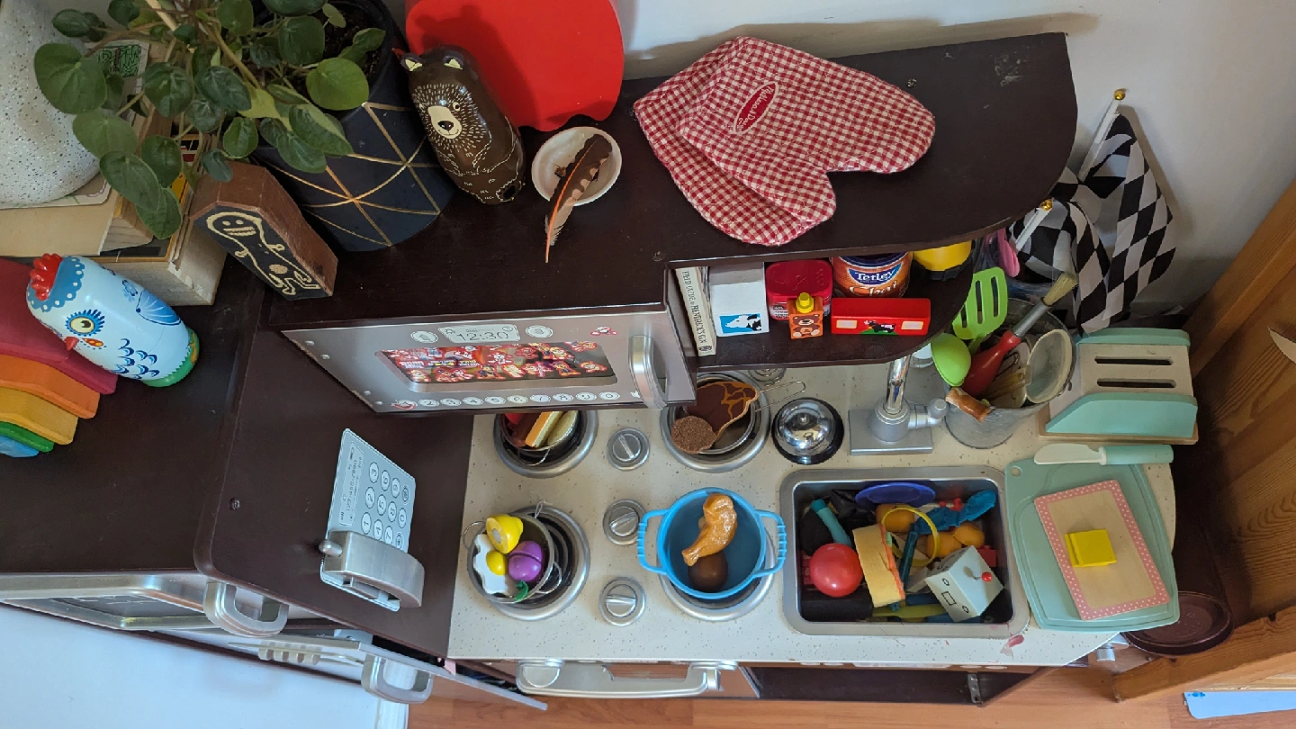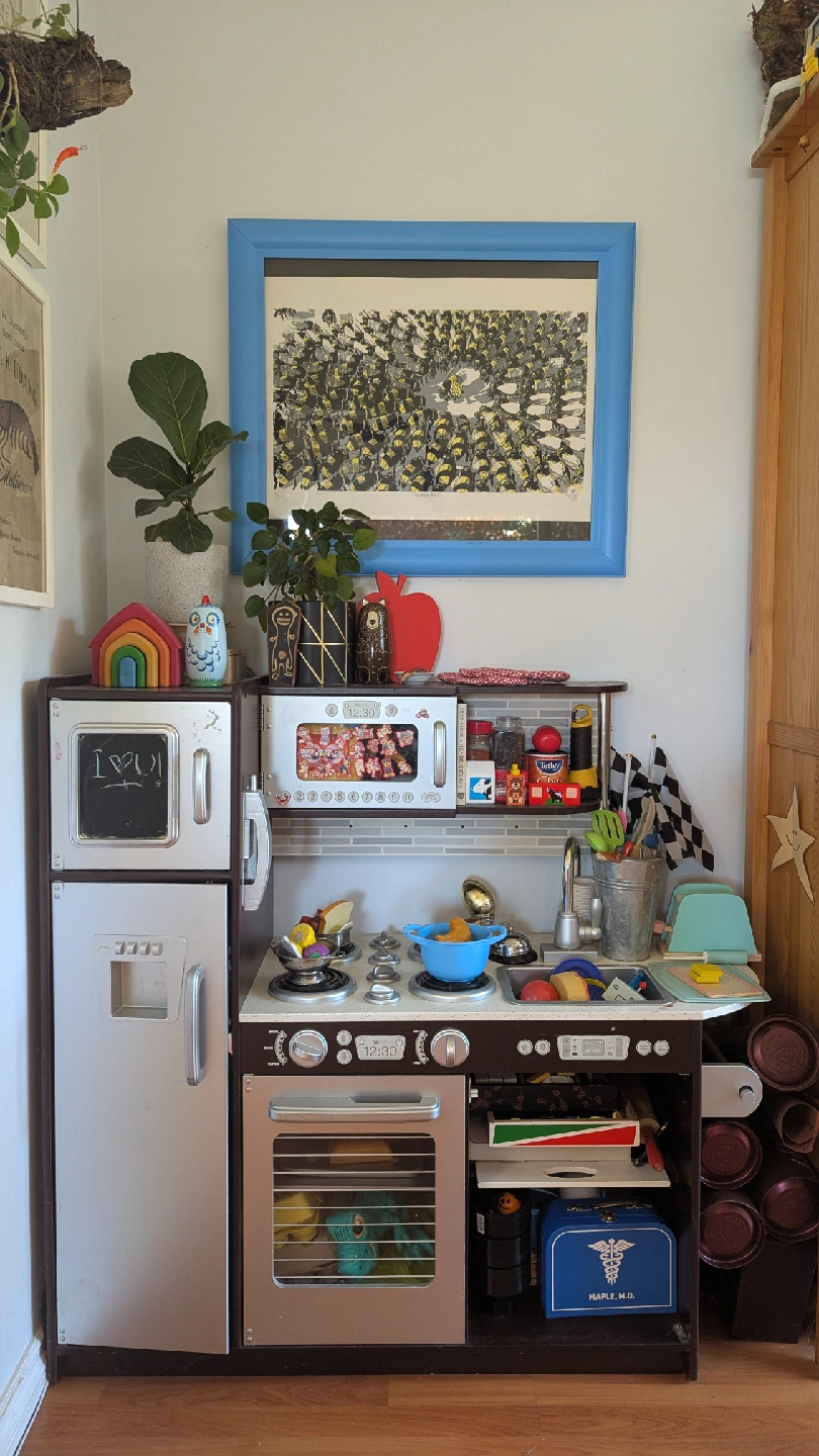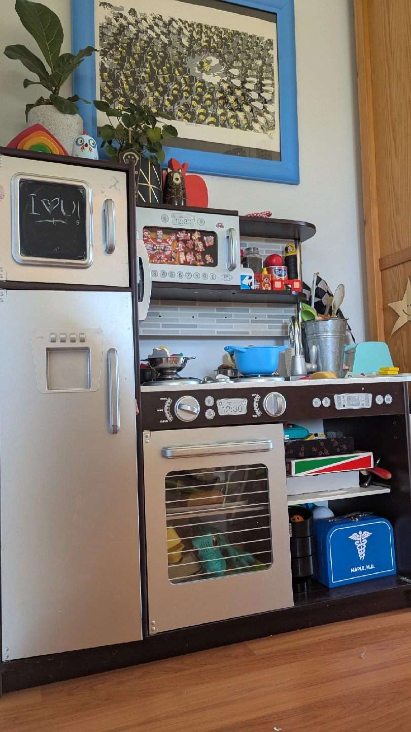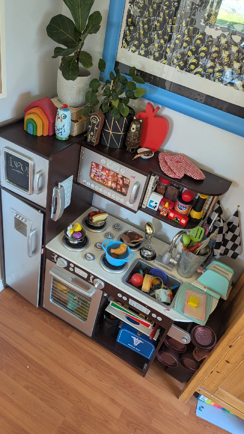 kidkraft kitchen in good play condition, door is missing in the bottom right cabinet and we've been using it as a shelf for the play kitchen. It features afridge, oven, microwave, and lots of space for play food and accessories... it has been awesome for imaginary play in our household but my child has grown out of it recently. Selling just the kitchen, accessories are separate.