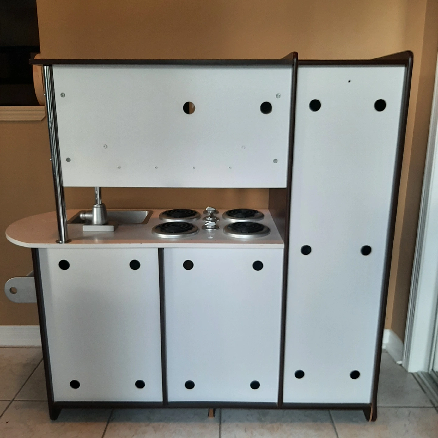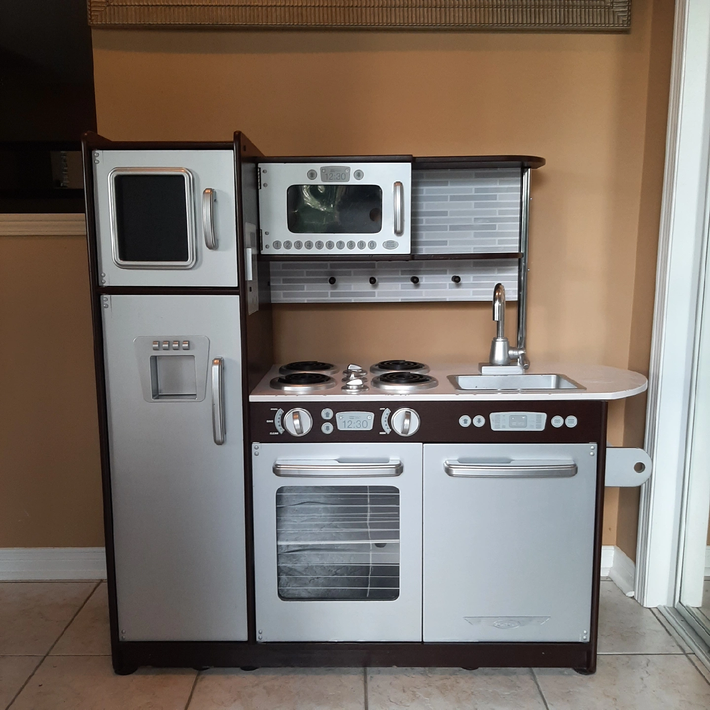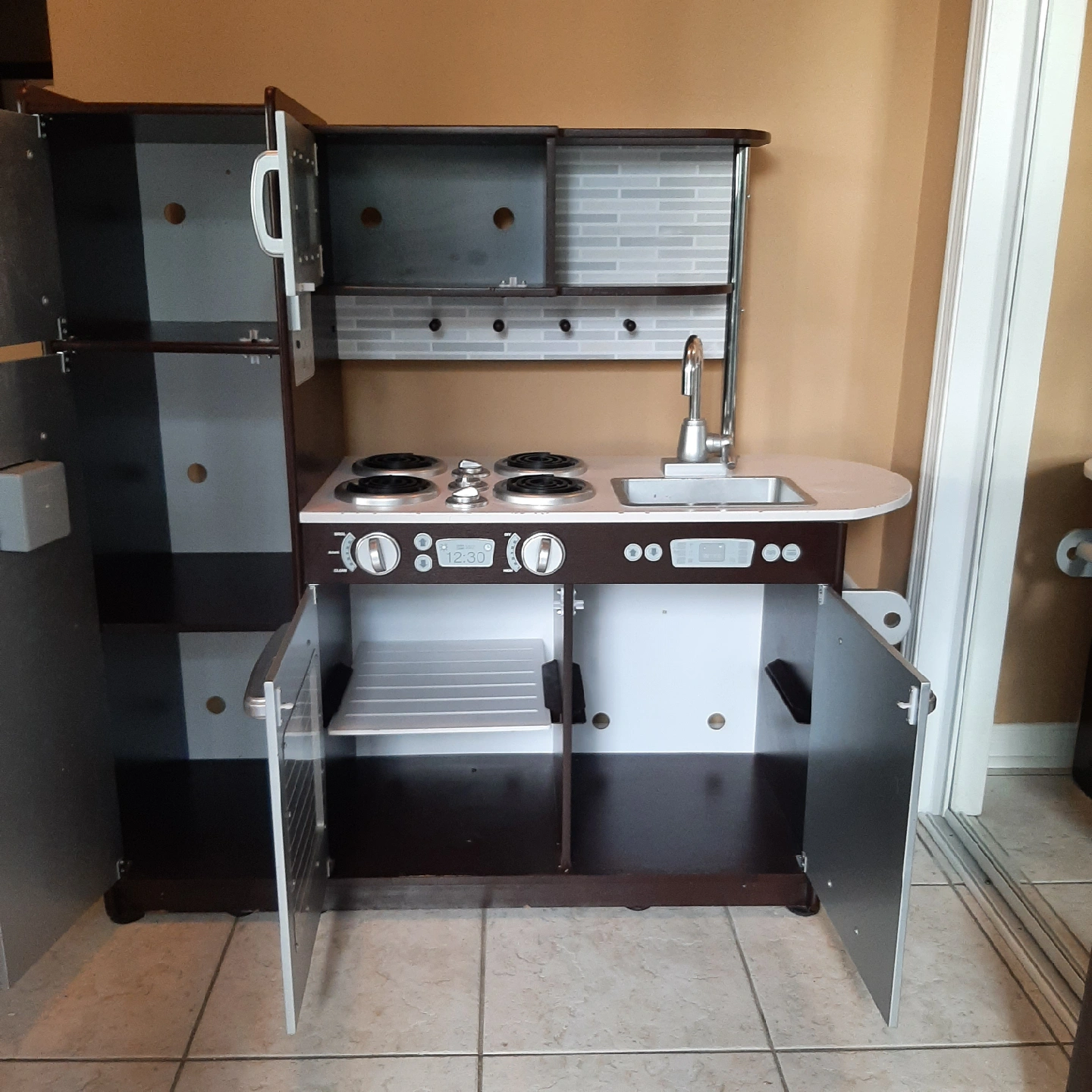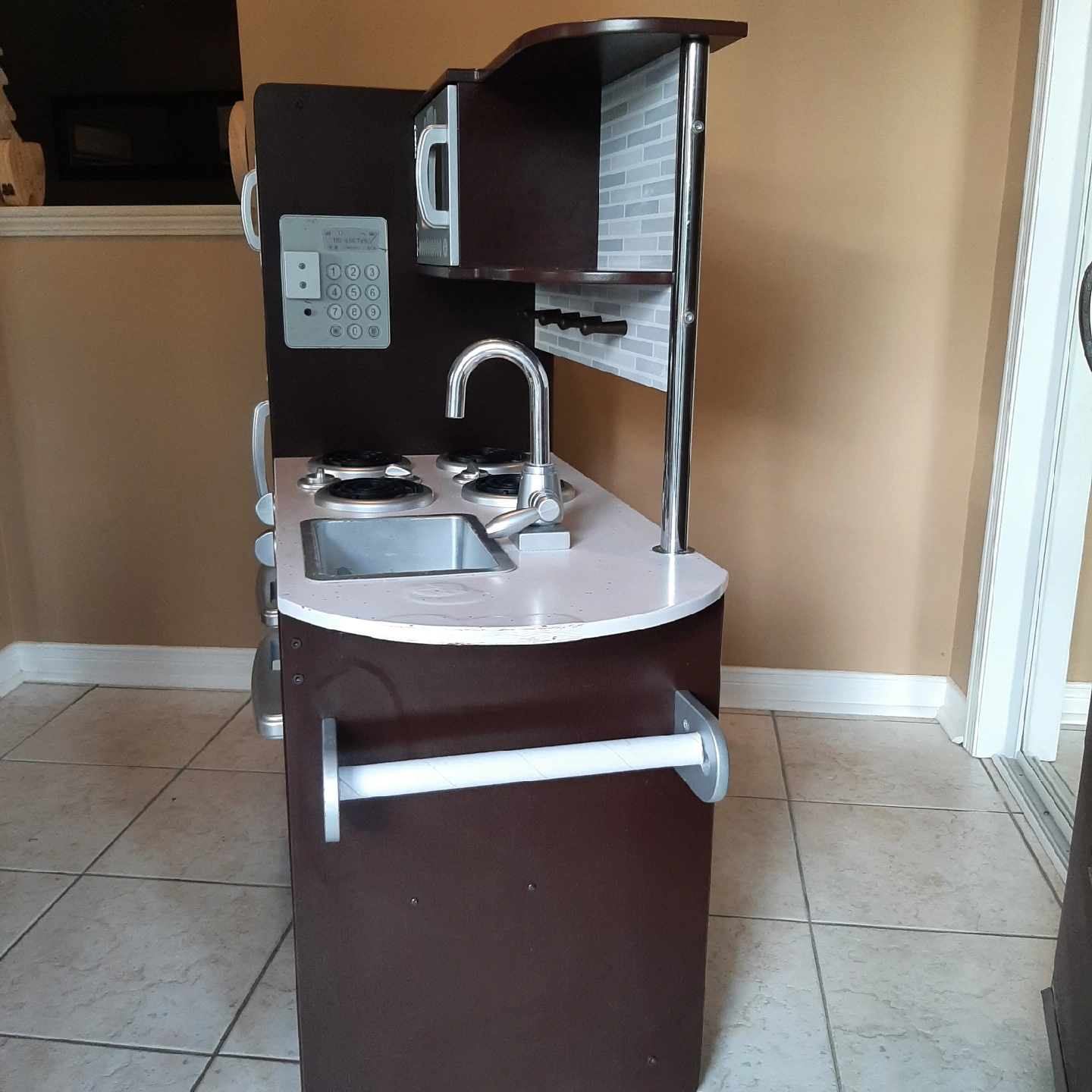 Selling a gently used KidKraft kitchen playset. It's a great toy for kids who love to pretend play chef. There is some minor damage on the side, but overall it's in good condition qnd does not effect functionality. Perfect for hours of fun!