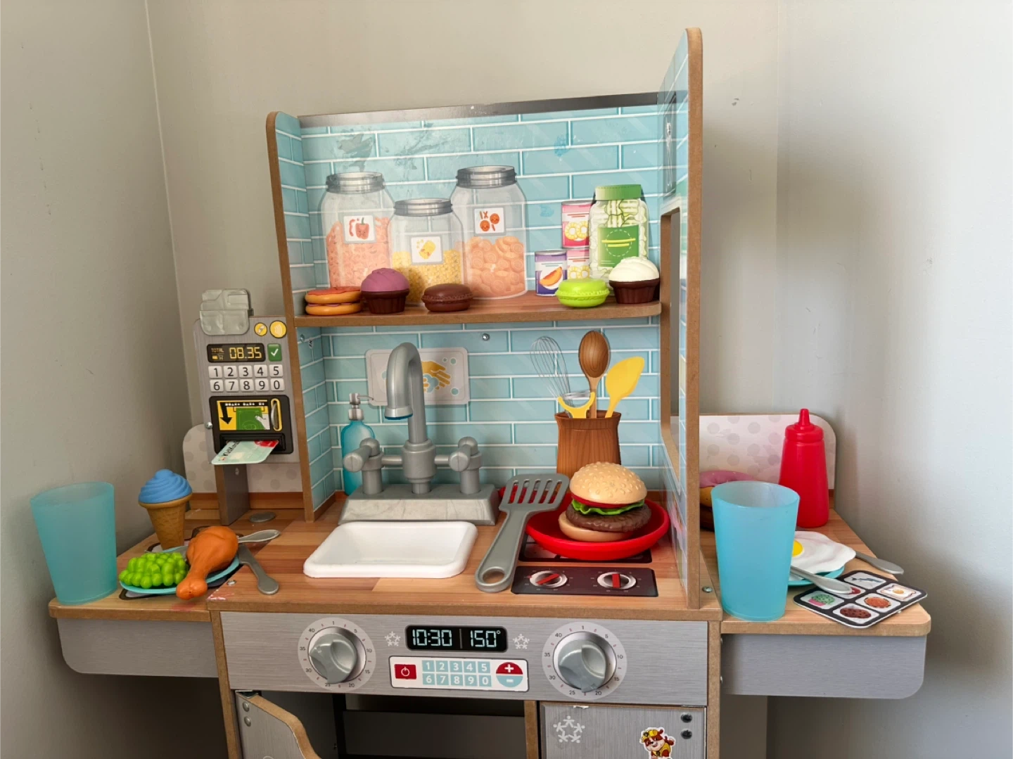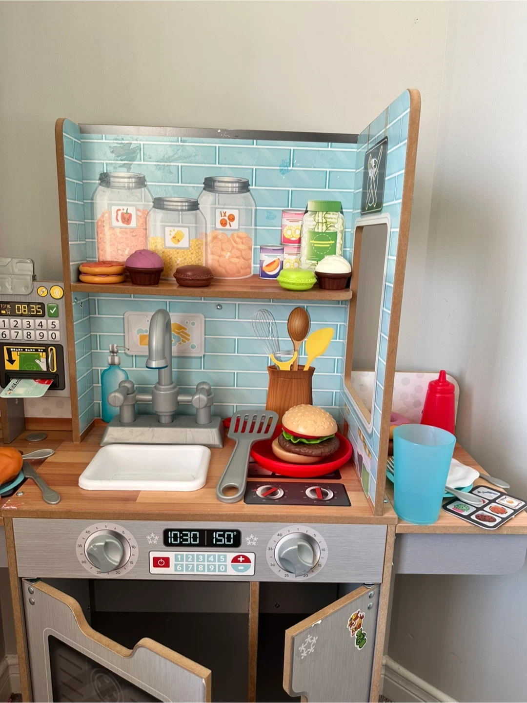 28Selling a cute KidKraft play kitchen! It's in great shape and ready for a new little chef to enjoy. Features include a sink, oven, and stovetop with fun details like knobs and a play control panel. Perfect for imaginative play!