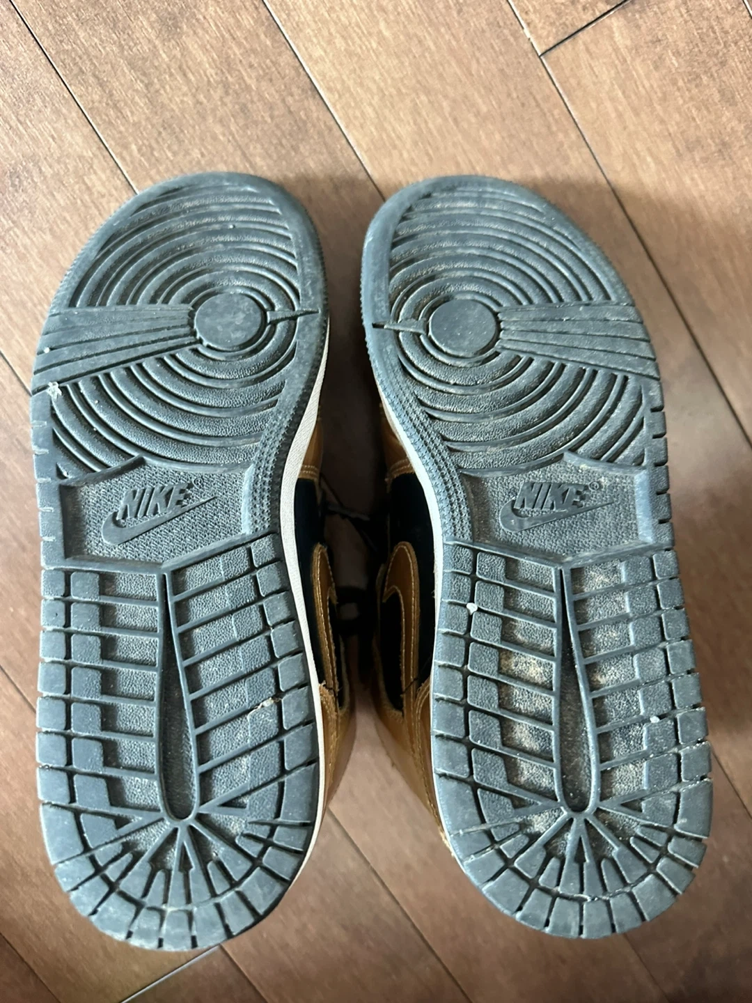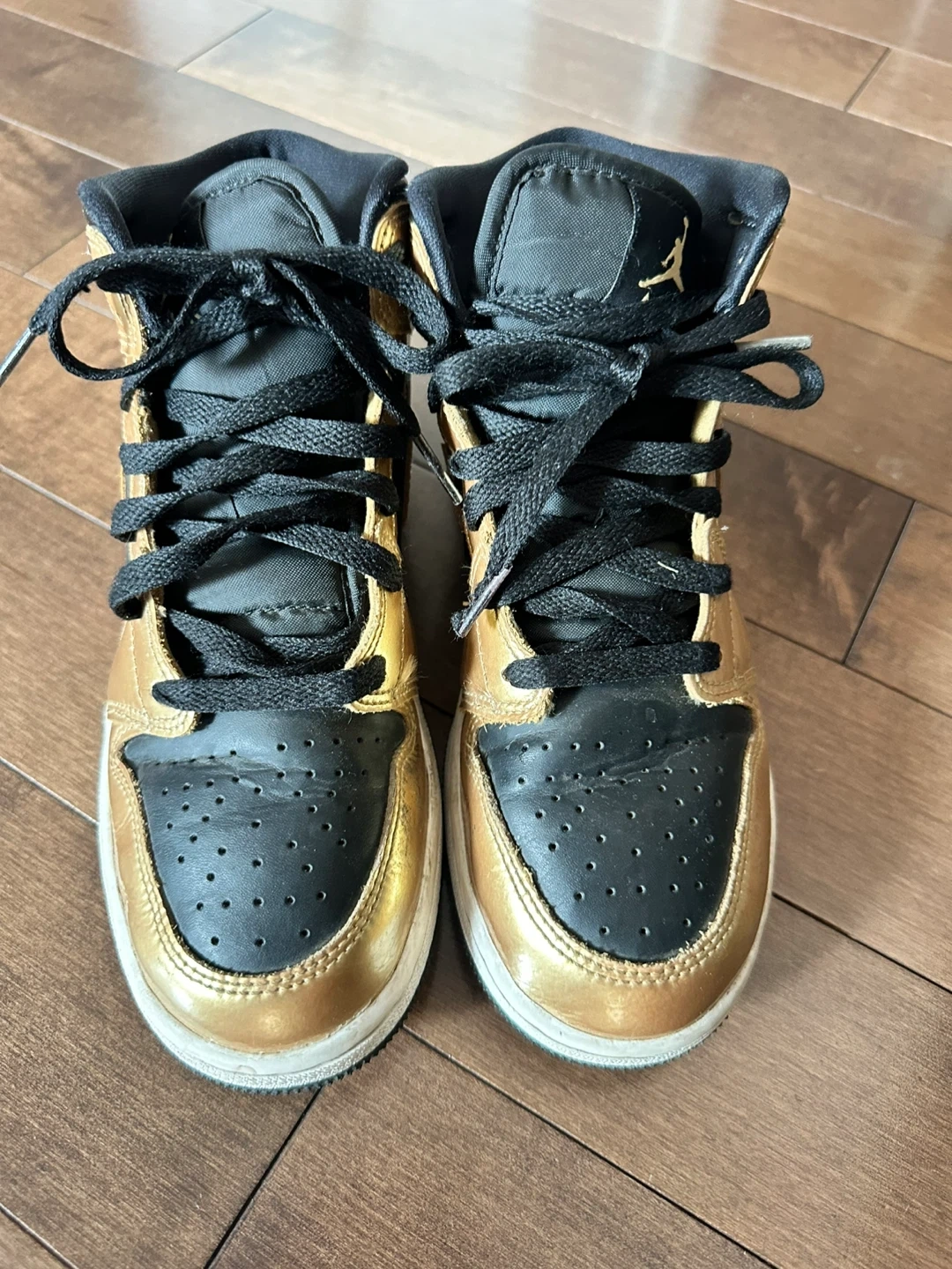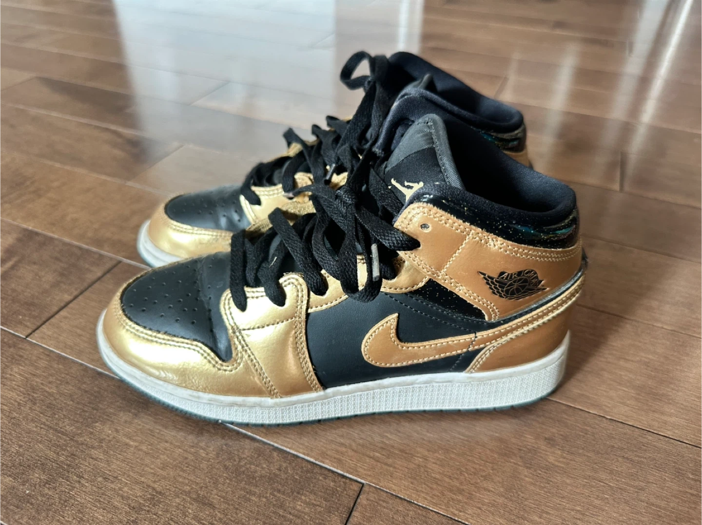 Selling a pair of Air Jordan 1 Mid sneakers in a stylish black and gold colourway! They're in good condition, perfect for adding some flair to your wardrobe. Check out the photos for details