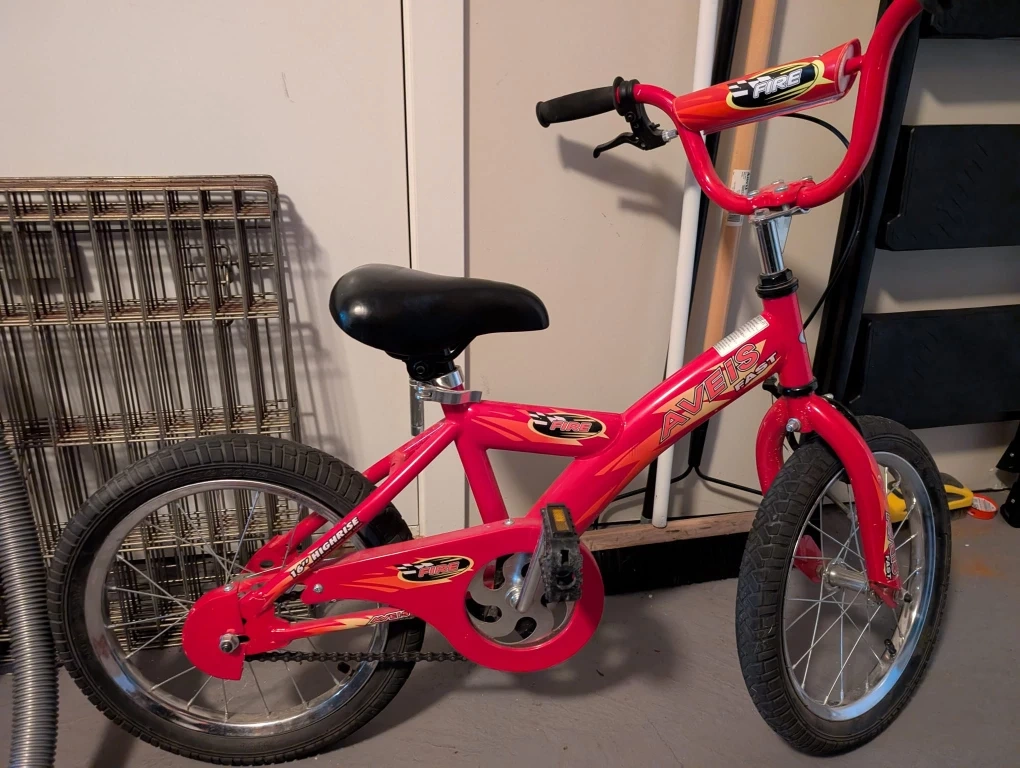 Red children's bicycle. Features a Fire design. Small size, suitable for younger children. 15" tires.