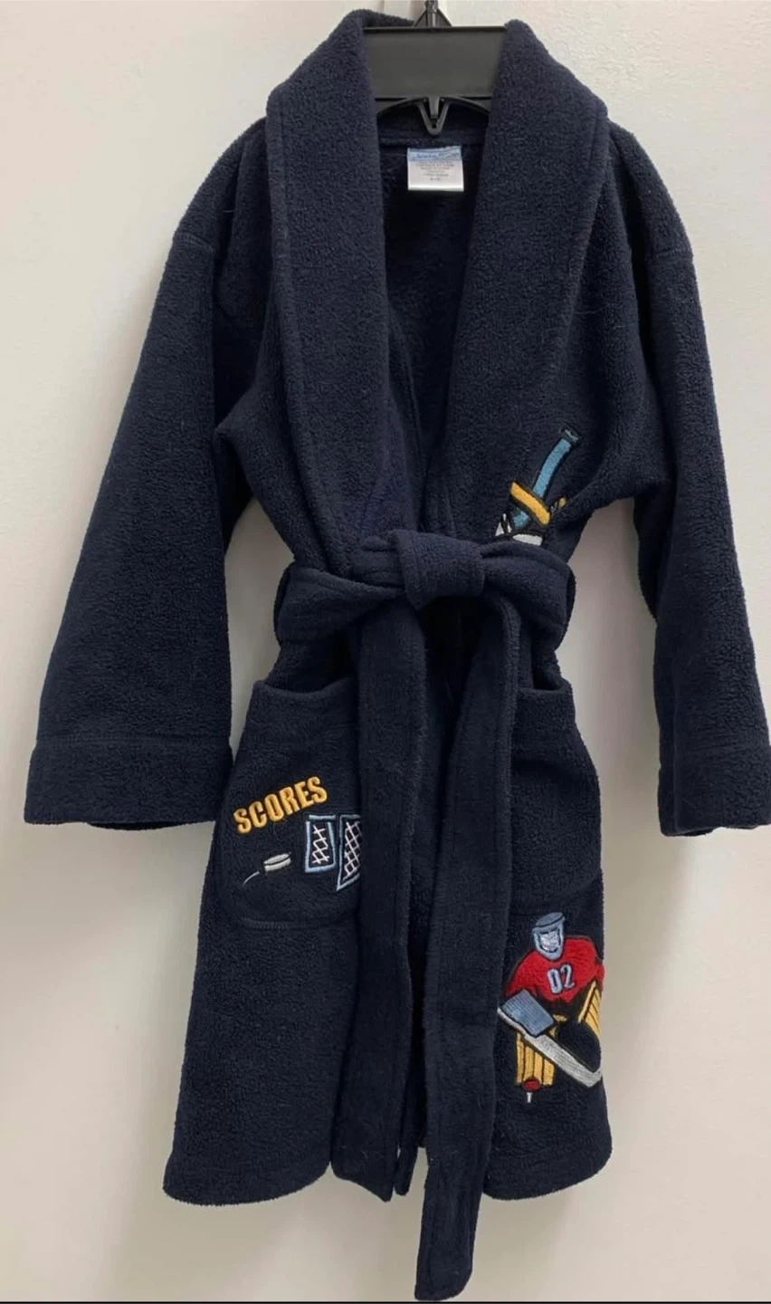 214A cozy bathrobe with hockey-themed designs. It has 2 pockets & a belt. Navy-blue. In very good condition.