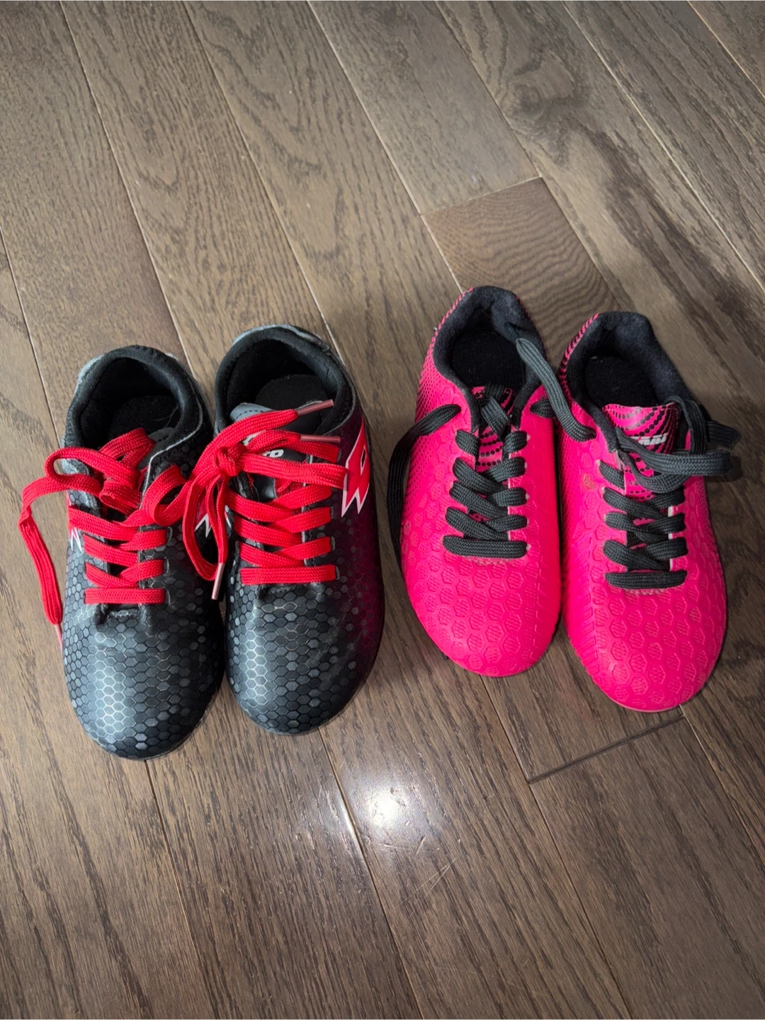 10Selling a pair of kids' soccer cleats! One pair is black with red laces, and the other is a vibrant pink with black laces. Great for the little soccer star in your family! Black pair size 11 Pink pair size 10 $15 each