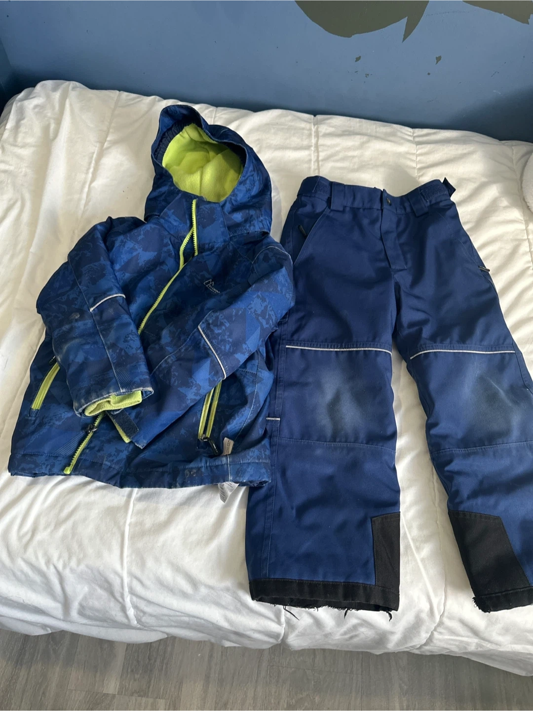 12Selling a used kids' snowsuit set in blue. It includes a jacket with a neon green lining and matching snow pants. There are some signs of wear, but it's still good for keeping your little one warm during winter activities