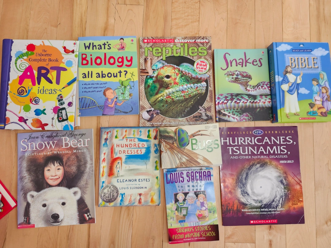 Selling a collection of kids' books in great condition! Titles include: - The Usborne Complete Book of Art Ideas (10) - What's Biology All About? (5) -The usborne book of Science experiments (5) - Scholastic Discover More: Reptiles(5) - Snakes(3) - Read and Learn Bible (10) new - Jean Craighead George Snow Bear - The Hundred Dresses by Eleanor Estes - Bugs (5) - Sideways Stories From Wayside School by Louis Sachar - Hurricanes, Tsunamis, and Other Natural Disasters