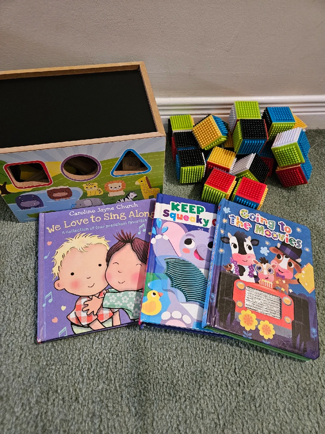 10Selling a set of kids' books and blocks. Includes three books: "We Love to Sing Along" by Caroline Jayne Church, "Keep Squeaky Clean", and "Going to the Mooovies". Also comes with a set of colourful blocks and a wooden shape sorter with wooden blocks inside, perfect for preschool-aged children!