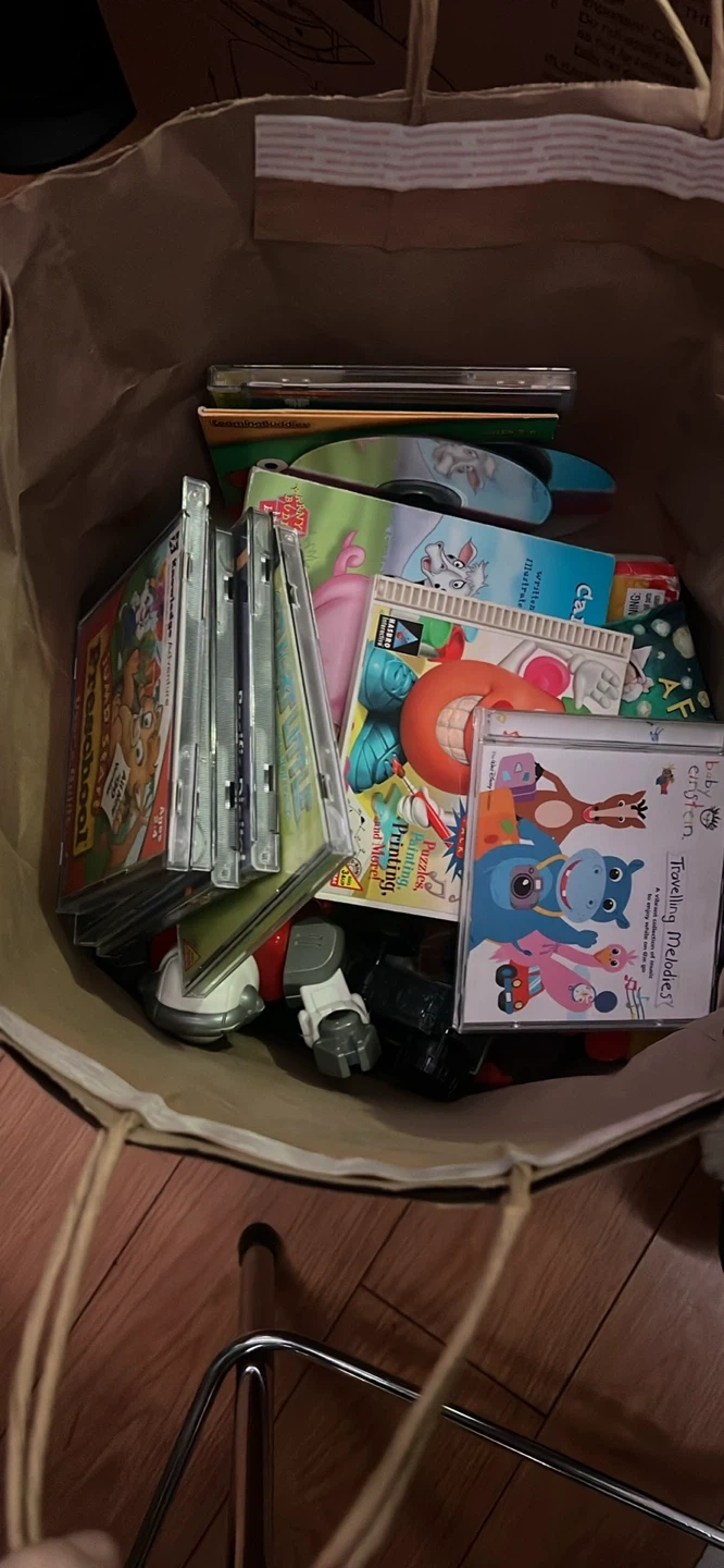 Selling a bundle of kids' items including books, CDs, and toys! There are LeapFrog and Baby Einstein CDs, and some books with illustrations. Perfect for keeping the little ones entertained and learning