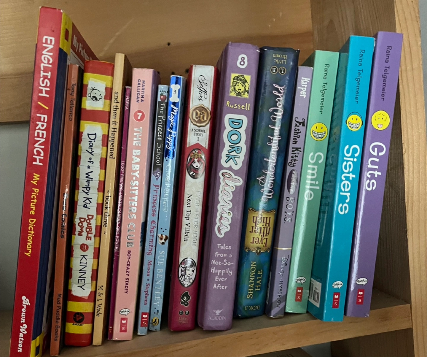 15A selection of kids' books, including: - Diary of a Wimpy Kid: Double Down by Jeff Kinney - Raina Telgemeier's Smile, Sisters, and Guts - The Baby-Sitters Club: Boy-Crazy Stacey - Dork Diaries #8 - Fashion Kitty and the B.O.Y.S. by Harper - Ever After High: Next Top Villain by Sue Bentley - The Princess School: Princess Charming by Martina & Galligan - English/French My Picture Dictionary by Brown Watson - Magic Puppy #3 - And more! $5 each