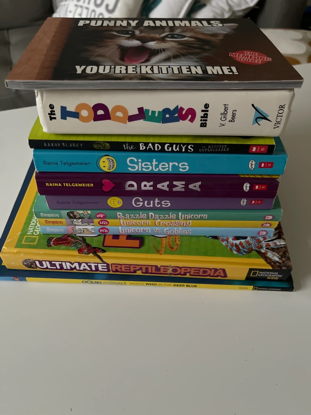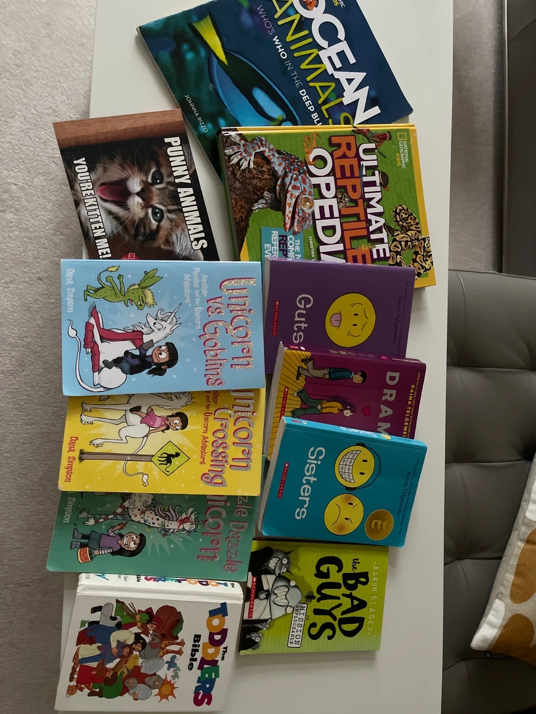 20Selling a collection of kids' books! Includes: - Ocean Animals - Ultimate Reptile-opedia - Punny Animals - Unicorn vs Goblins - Unicorn Crossing - Dazzle Unicorn - Guts - Drama - Sisters - The Bad Guys - The Toddlers Bible