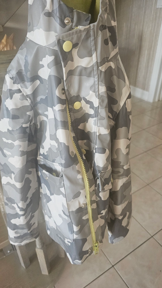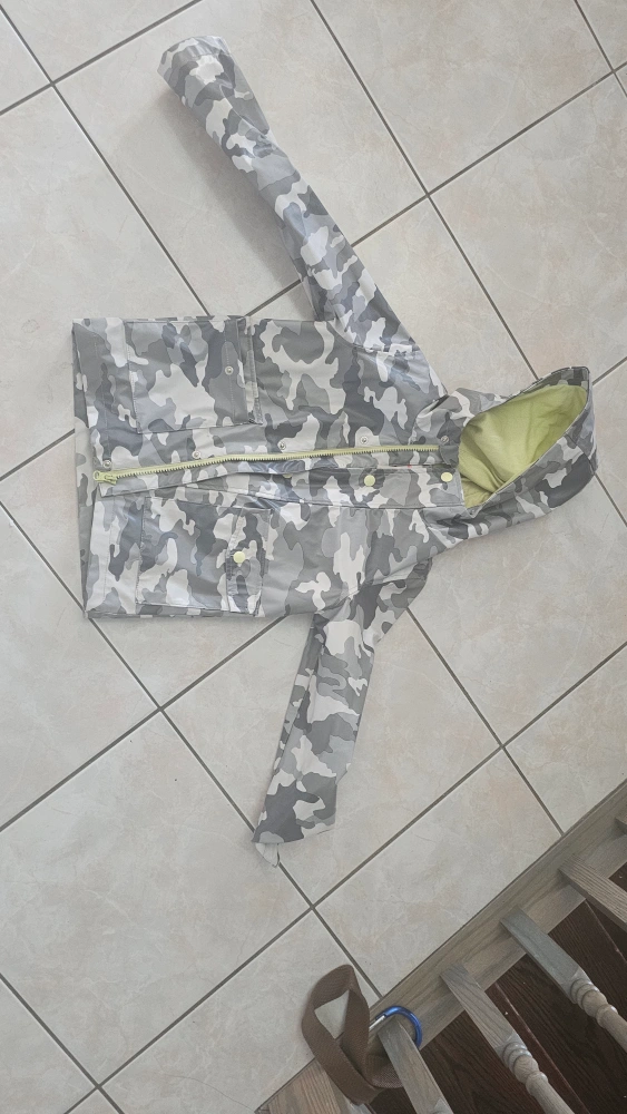 Selling a kids' raincoat with a cool camouflage pattern! It's in great shape and perfect for keeping your little one dry on those rainy days. The raincoat features a zipper closure and handy pockets for storing small items. It's a stylish and practical choice for any kiddo!