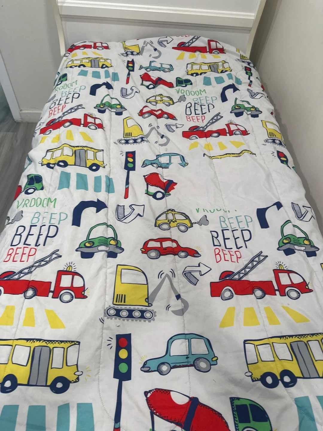 75This is a cute quilt with a fun car print! It features buses, fire trucks, cars, and construction vehicles. Perfect for a child's room
